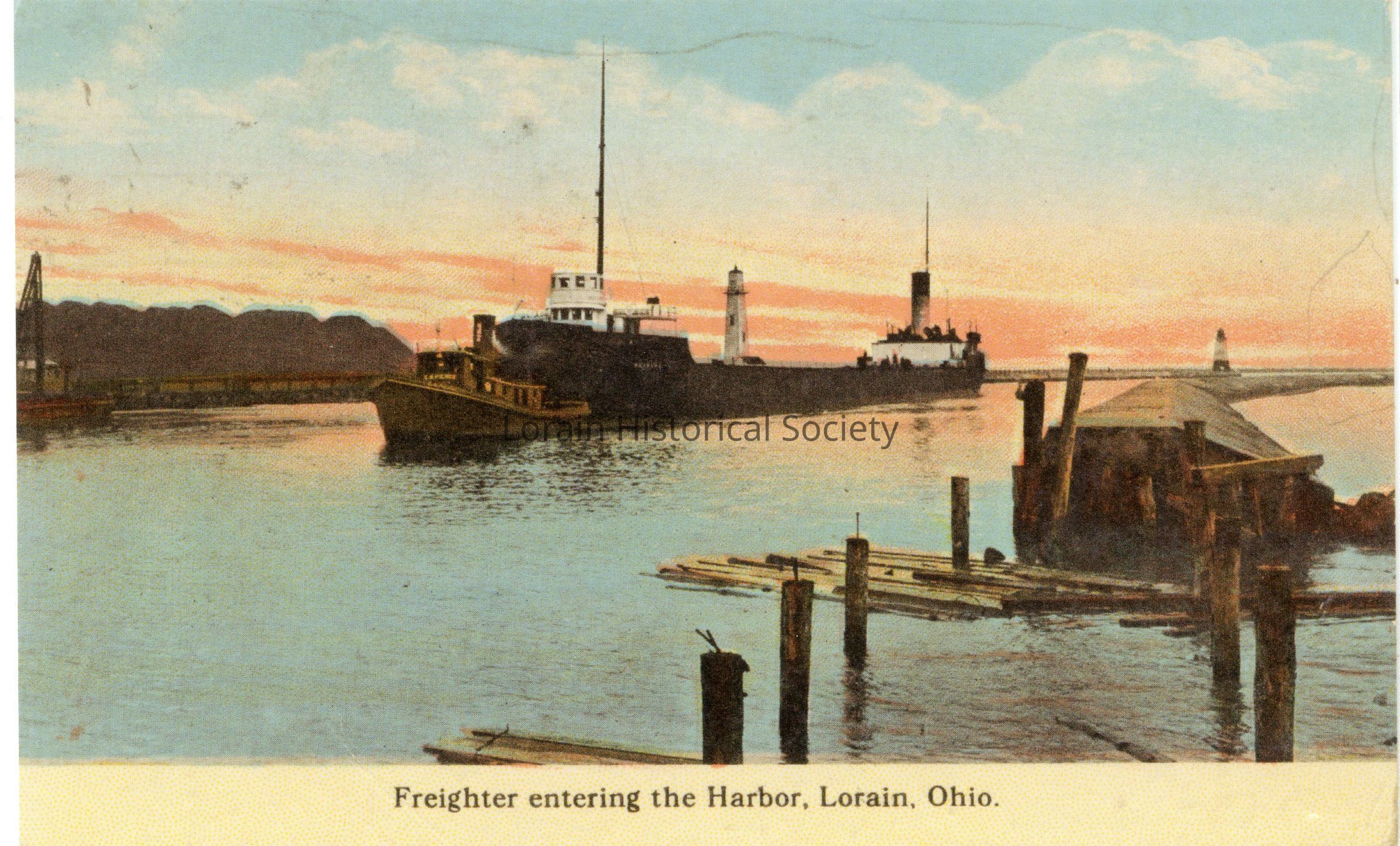 06/02/2021 AMS: jda040203015. Photo of Color Postcard marked as photo "c" in "Black River Scenes". Postcard reads: "Freighter entering the Harbor, Lorain, Ohio."
