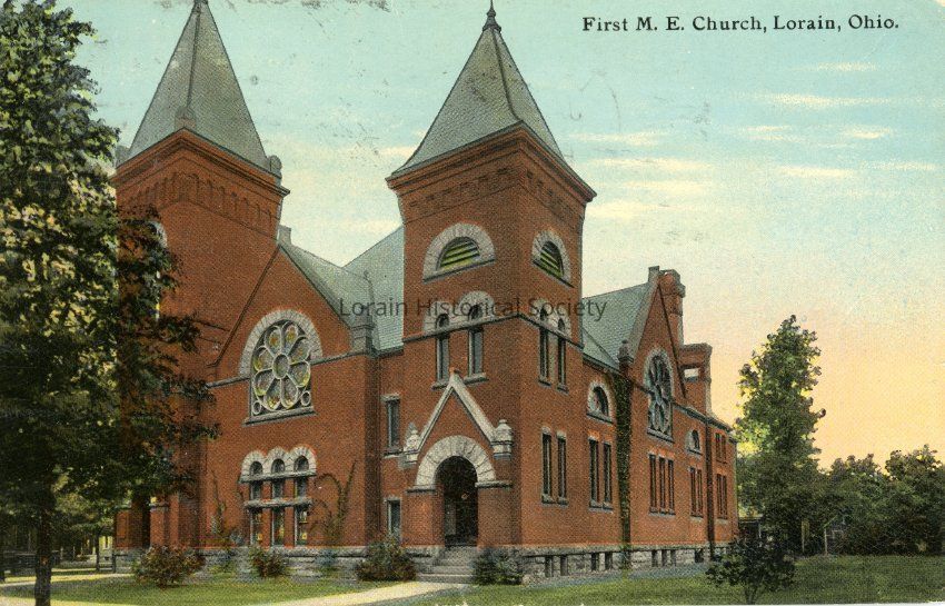 04/17/2022 AMS: jfm083104010. Color postcard is view of First M. E. Church. Postcard reads: "First M. E. Church, Lorain, Ohio".