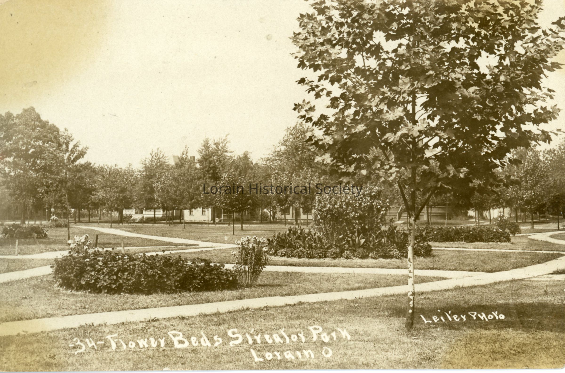 10/26/2022 AMS: jfm020706006. Black and white postcard is view of the flower beds at Streator Park. Postcard reads: "34-Flower Beds Streator Park Lorain O Leiter Photo".