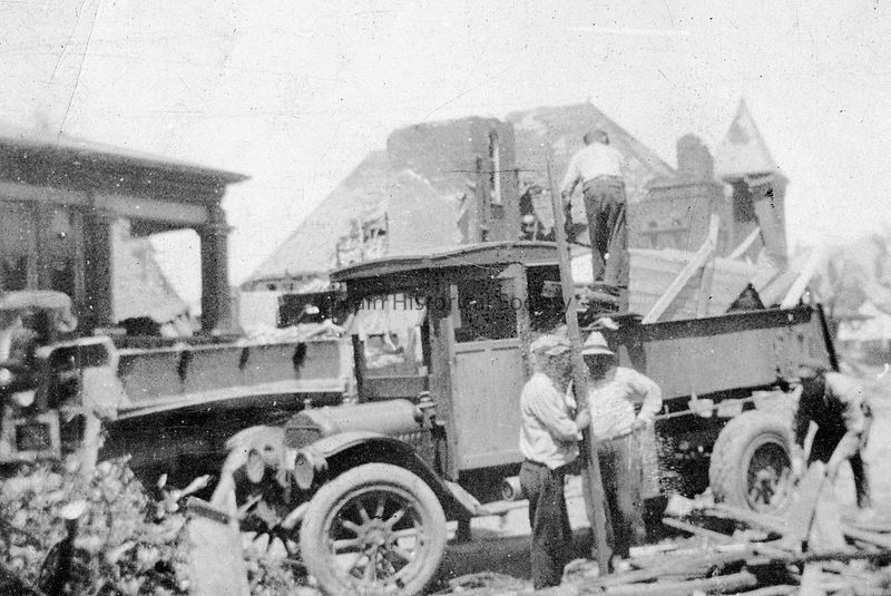 Photograph is black and white view of unidentified house on Washington Avenue showing damage destruction and debris from 1924 Tornado. Truck and workers in front picking up debris. Saint Mary's Roman Catholic Church, 300 West Eighth Street in background.Photograph Details