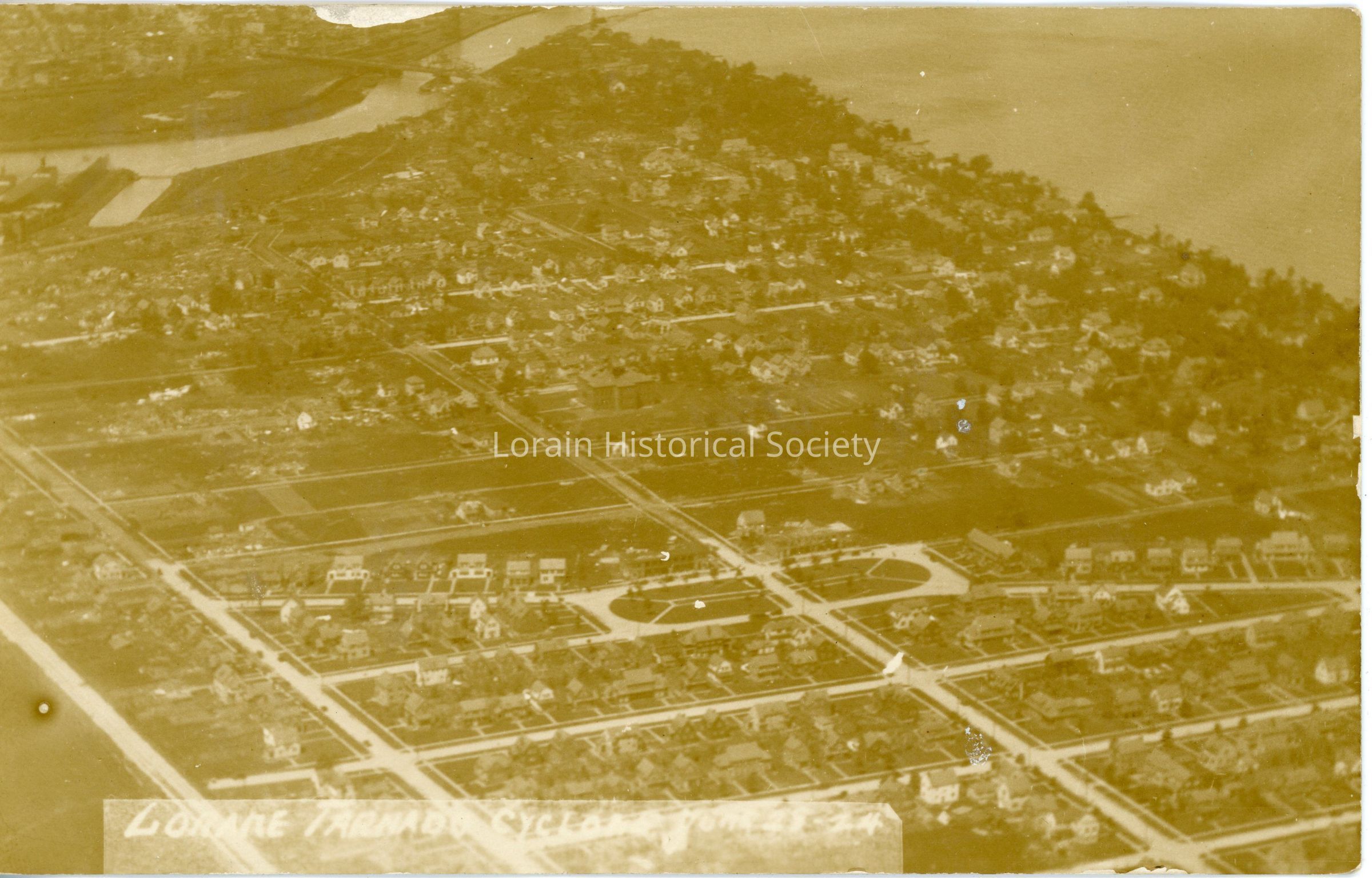 Postcard is aerial view of Lorain East Side showing damage from 1924 Tornado. Postcard reads: "LORAINE TORNADO CYCLONE June 28-24".Acquisition