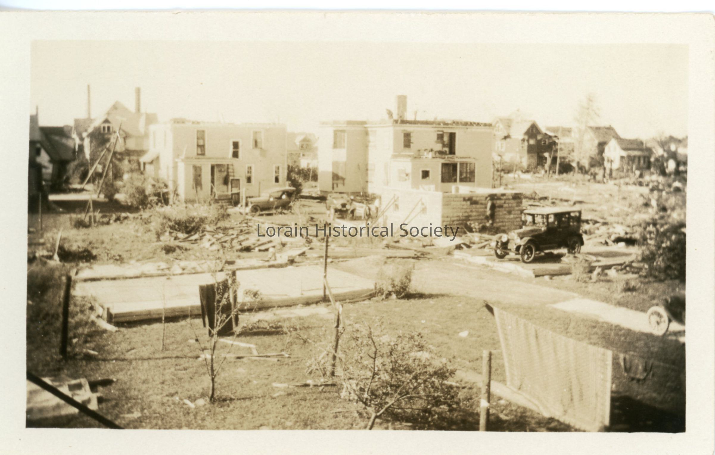 Photograph is black and white view of unidentified houses showing damage, destruction and debris from 1924 Tornado.Acquisition