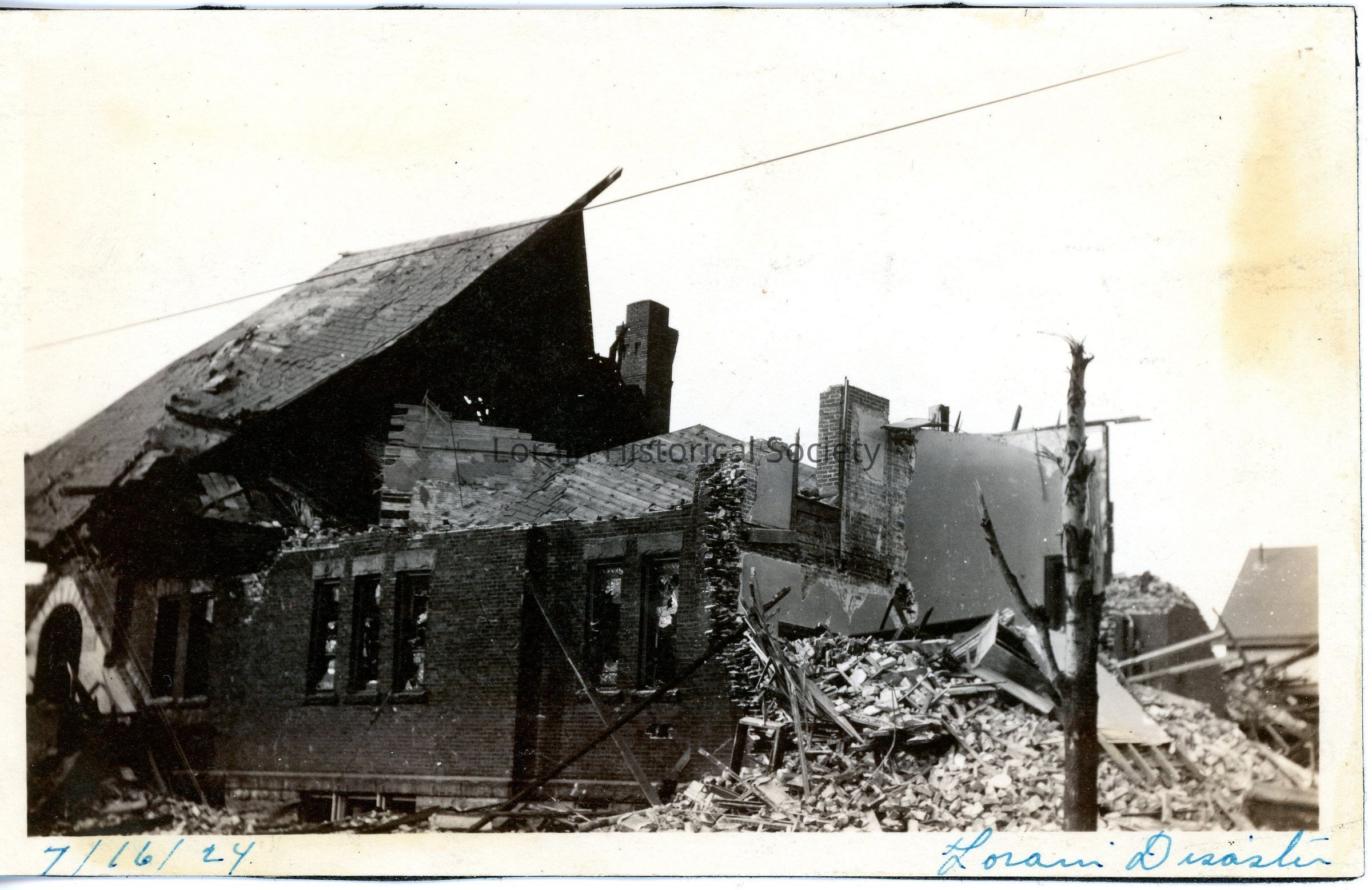 Photograph is black and white view of First Methodist Episcopal Church, 224 West 6th Street, showing damage and destruction from 1924 Tornado. Written on photo: "7/16/24 Lorain Disaster".Acquisition
