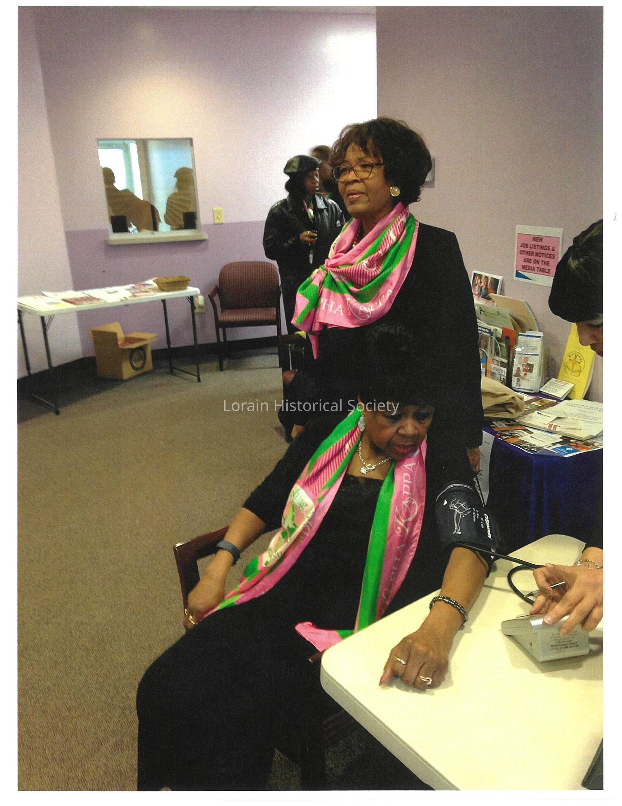 Photo of two members of Alpha Kappa Alpha sorority. One is standing and one is seated having her blood pressure taken. The names "Joyce Jackson" and "Freddie Springfield" are written on the back of the photo.Collection