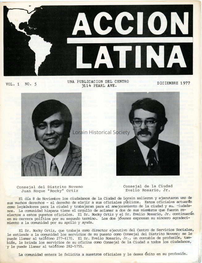 Accion Latino Newsletter Vol. 1 #5. Produced by El Centro. Only 3 of 6 pages were scanned. All in Spanish. Photos of Ninth District Councilman Juan Roque "Rocky" Ortiz and City Councilman Evelio Rosario, Jr.