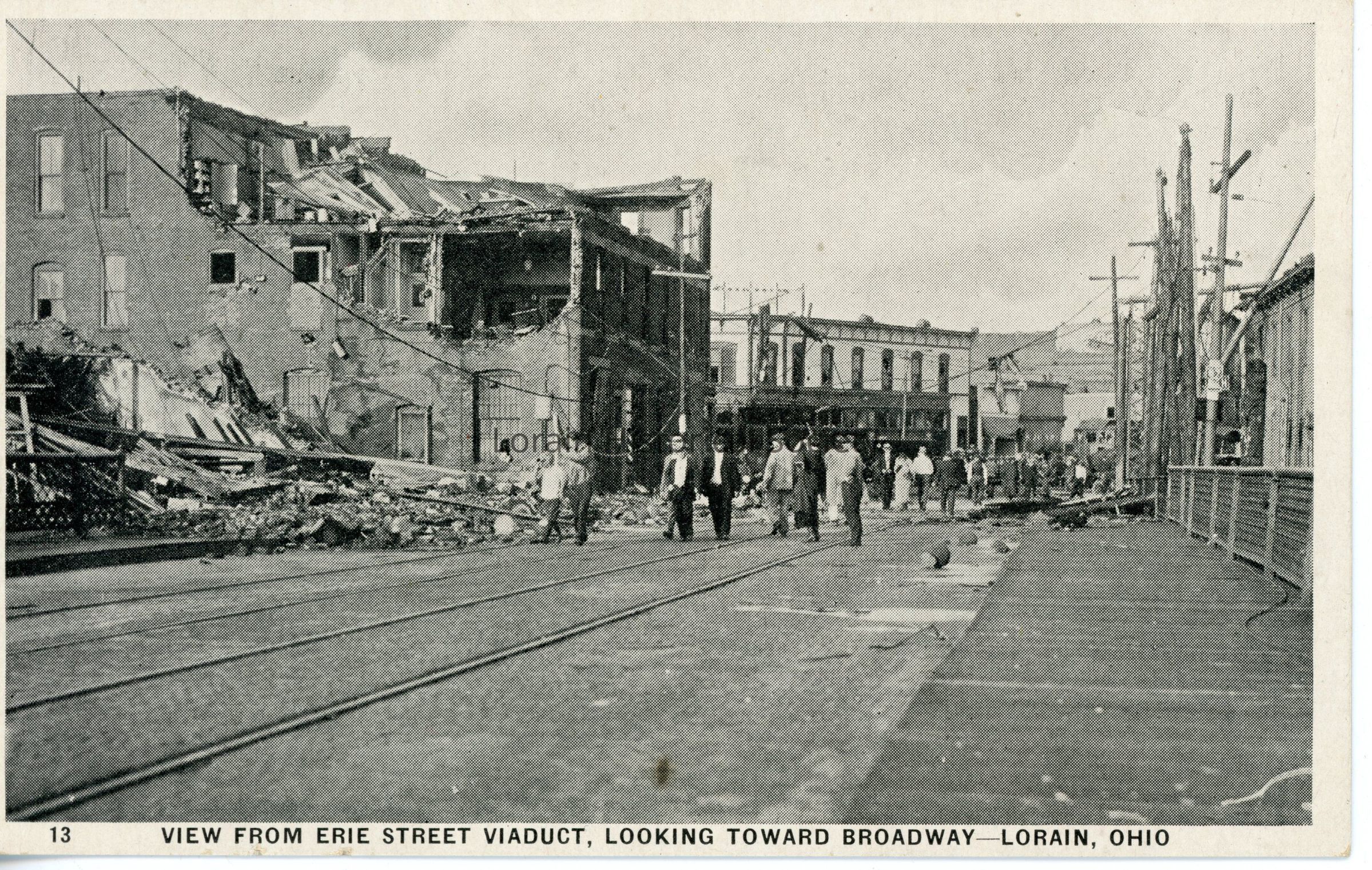 Postcard is view of Erie Avenue Viaduct looking toward Broadway showing damage and destruction from 1924 Tornado. L to R: Reagan's Grocery (debris behind Wagner Building); Wagner Building (corner of Broadway and West Erie Avenue); Heilman's Restaurant (corner of West Erie Avenue and Broadway (across the street from Wagner Building); Swamp Lily Hotel (corner of North Broadway and West Erie Avenue). Postcard reads: "No. 14. FROM ERIE ST. VIADUCT LOOKING TOWARD BROADWAY, LORAIN, OHIO".Acquisition