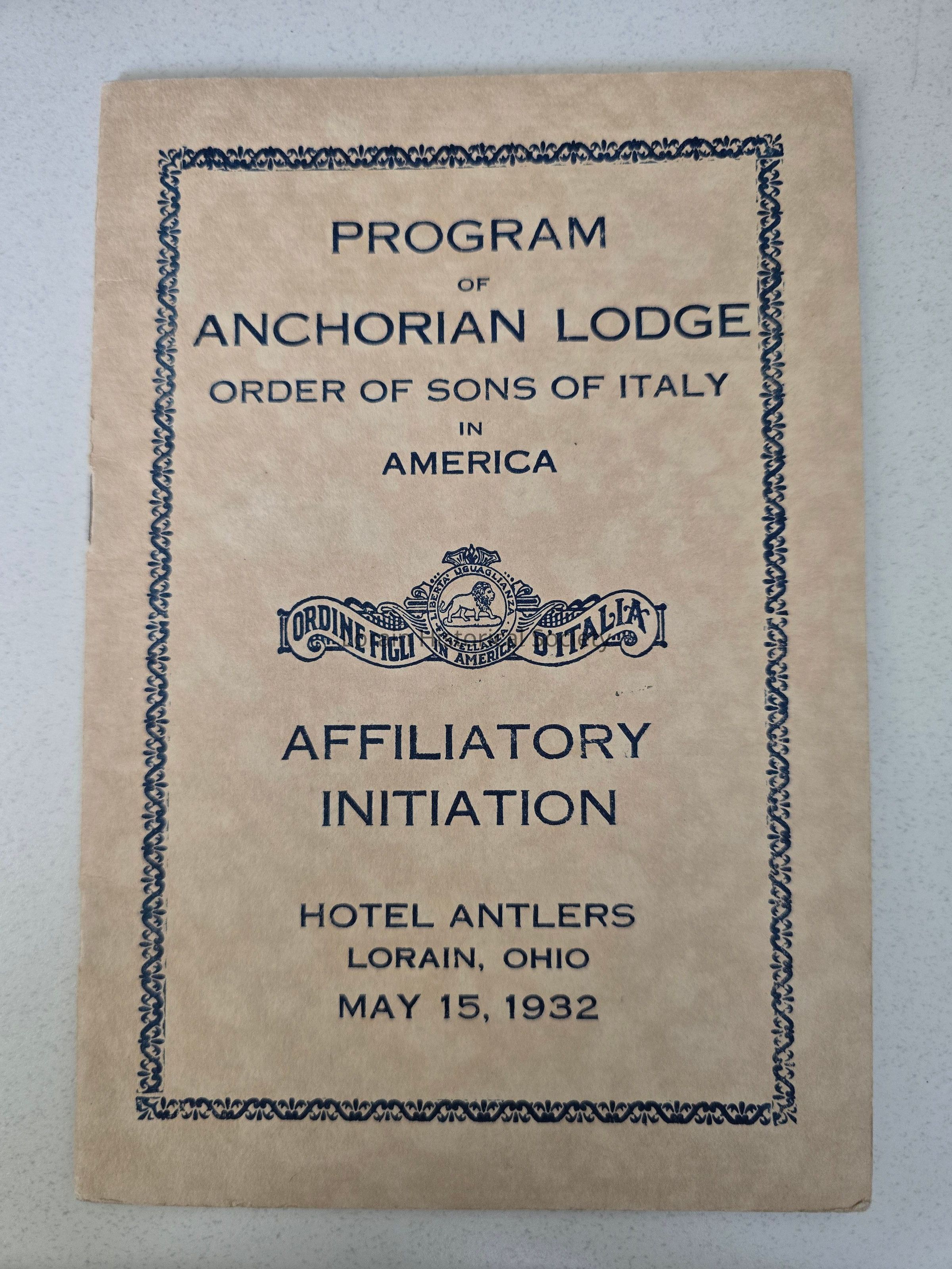 Program of Anchorian Lodge Order of Sons of Italy in America. Affiliatory Initiation held at Hotel Antlers in Lorain. May 15, 1932.Acquisition