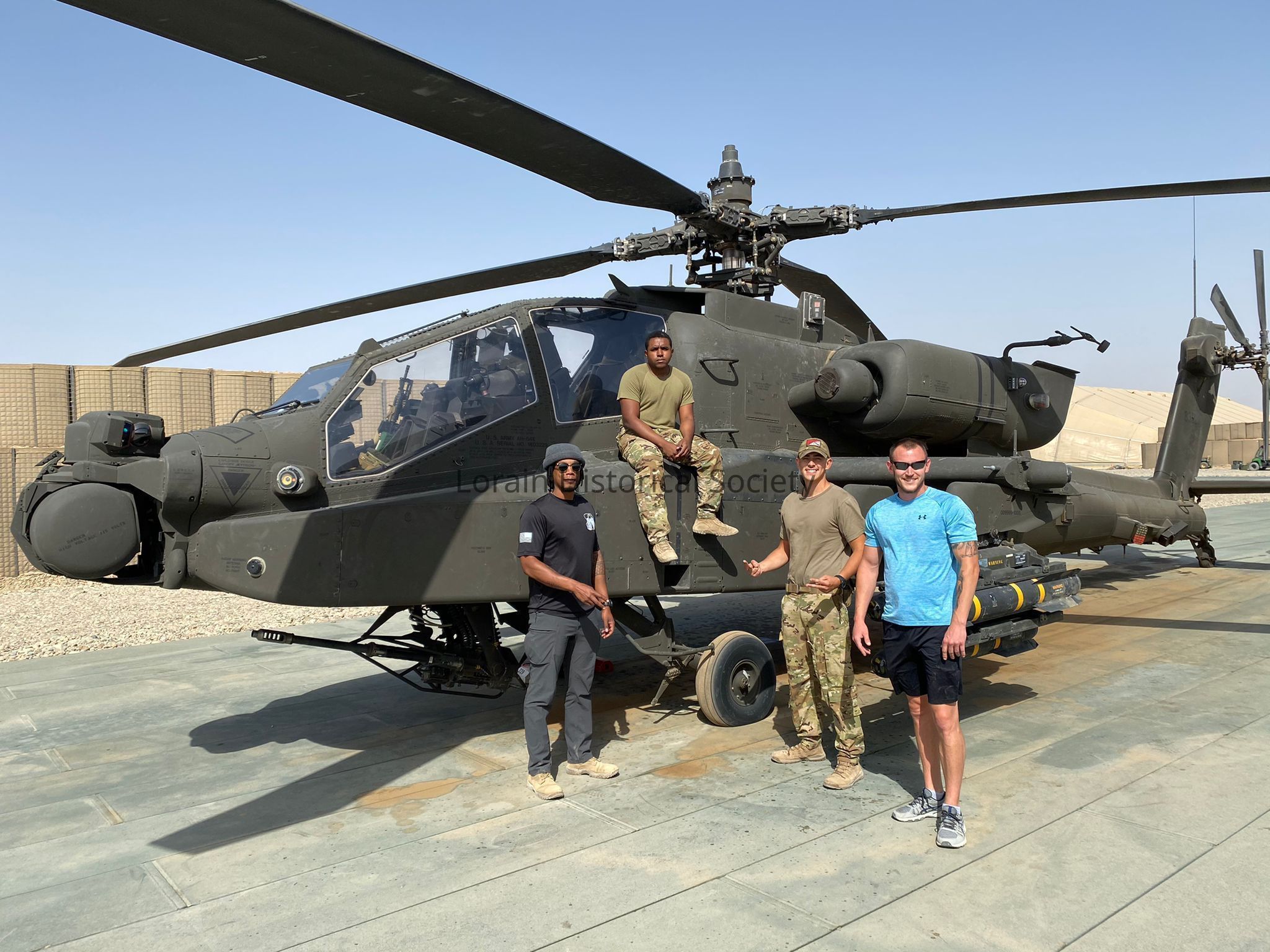 Photo of Ryan Gatrell (second from right) and three other soldiers with an AH-64 Apache attack helicopter in April 2021. They were at Camp Dwyer in Afghanistan. Ryan served with the U.S. Army and participated in the U.S. retrograde from Afghanistan.Collection