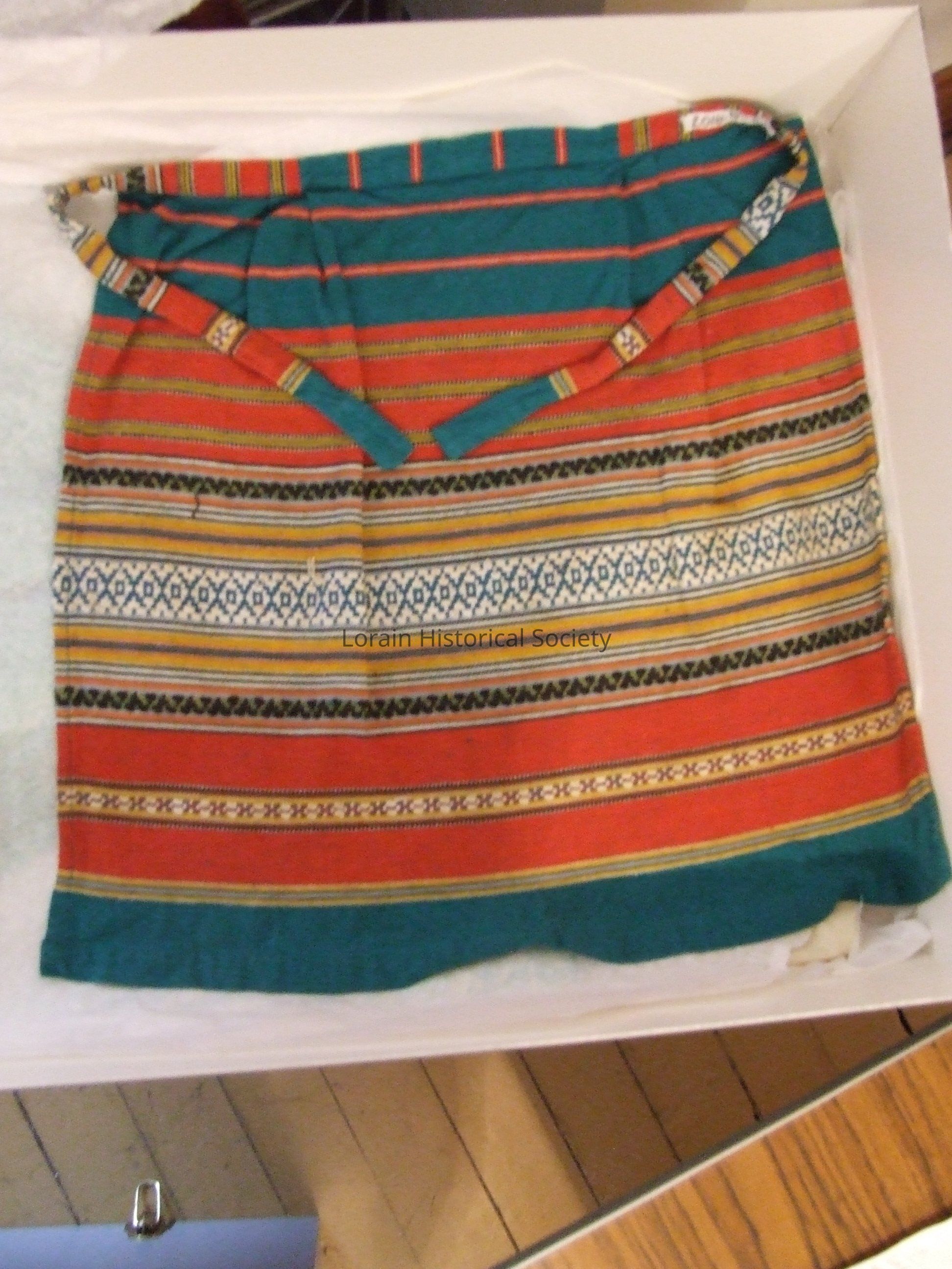 Woven with several horizontal colors and patterns running through it.