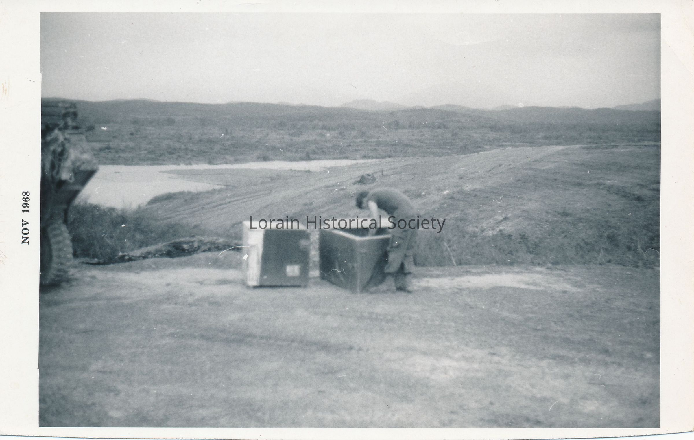 Photo of Ralph DeJesus' sergeant looking inside one of two large boxes at the Landing Zone in Vietnam. The boxes contained a generator and a freezer. The Landing Zone was also known as "LZ Nancy" and "Firebase," and was approximately 9 miles from Vietnam's Demilitarized Zone (DMZ). Vietnamese people who surrendered came up to the Landing Zone and hid behind these boxes. Mr. DeJesus was in the U.S. Army during the Vietnam War.Collection