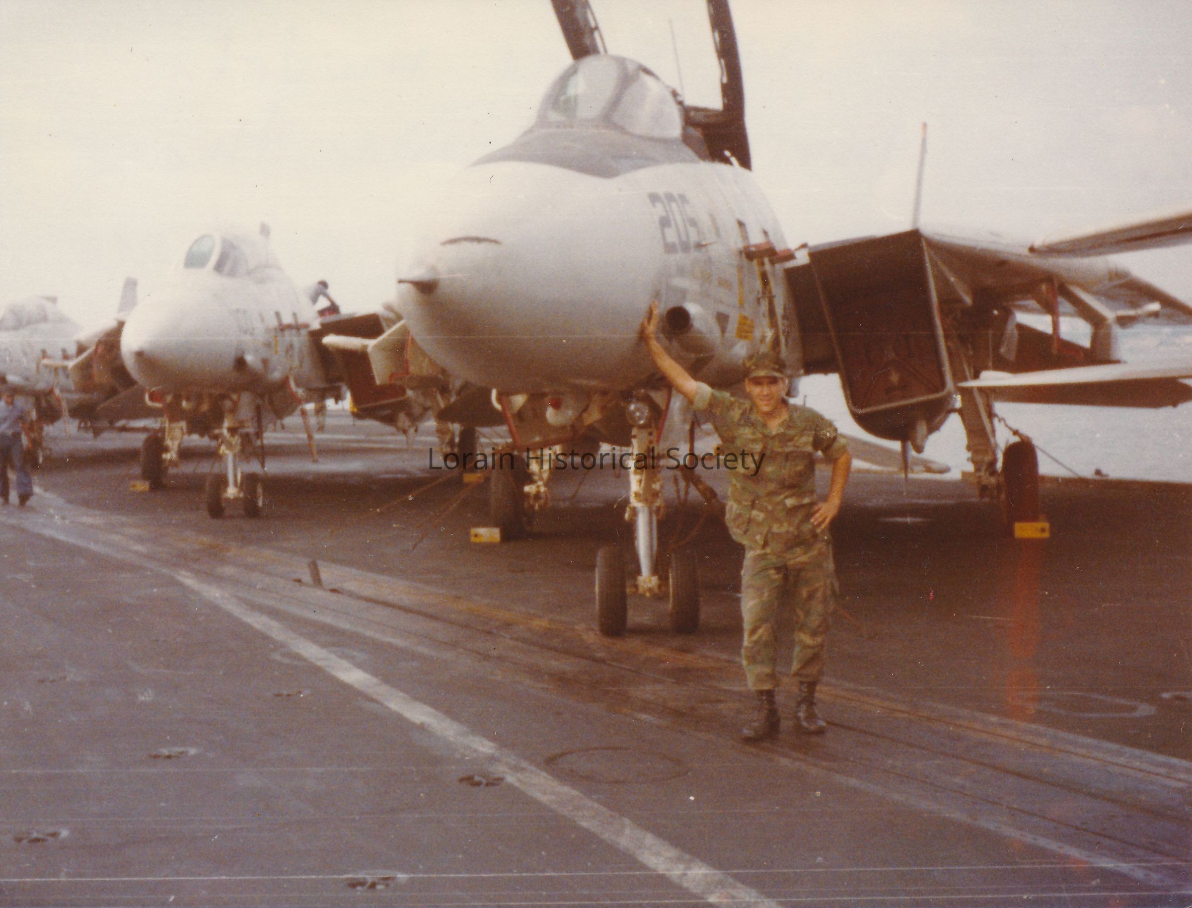 Photo of Arvin Morell posing next to a plane aboard the U.S.S. Nimitz in the early 1980s. Arvin is wearing his fatigues. Three planes are pictured. The note on the back of the photo states that these planes were the same model as the plane that shot down two planes in Lebanon. Arvin served in the U.S. Marine Corps between 1980 and 1984 and participated in military peace-keeping operations in Lebanon during the Lebanese Civil War.Collection