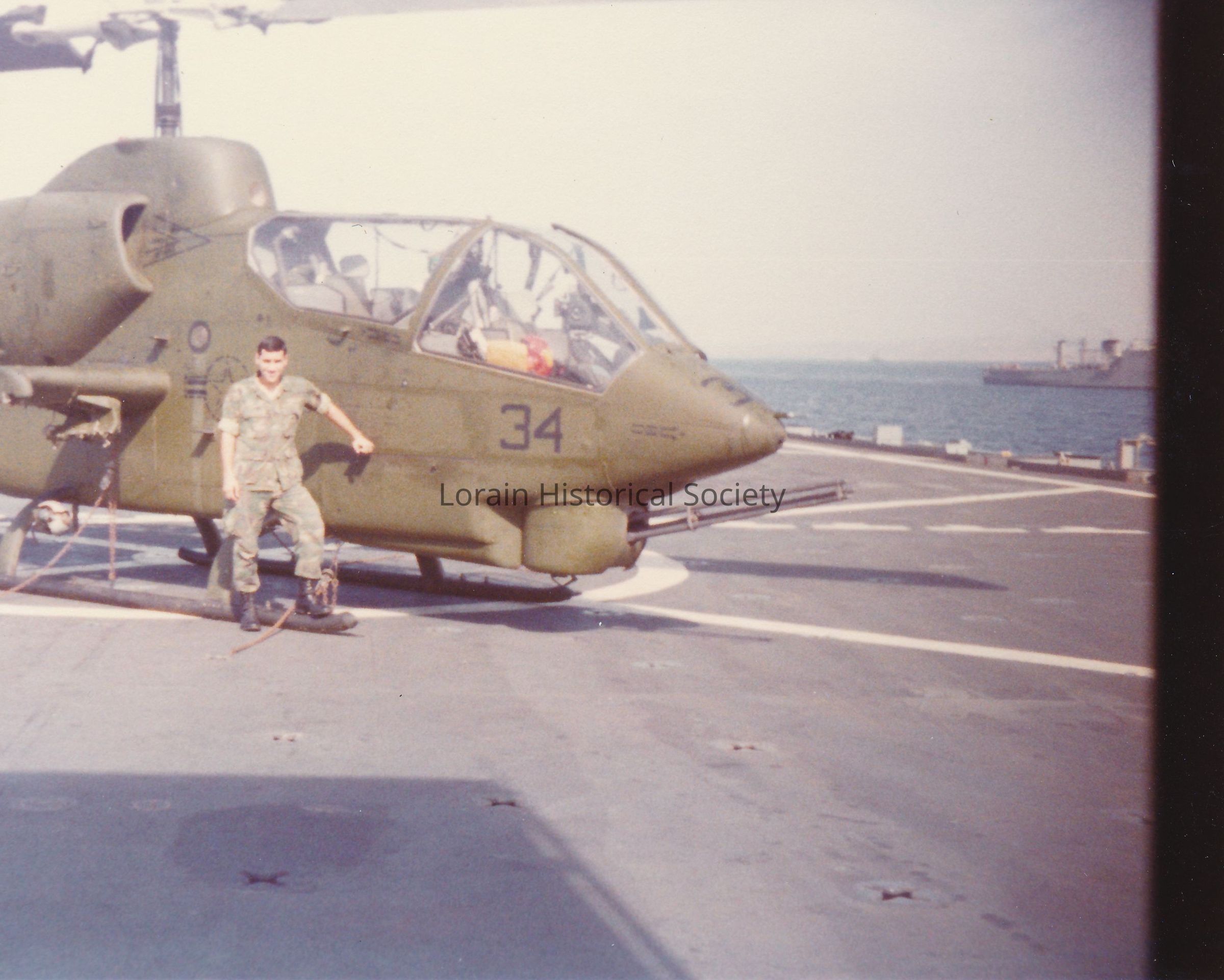 Photo of Arvin Morell posing with a plane aboard the U.S.S. Nimitz in the early 1980s. Arvin is wearing his fatigues. Another U.S. Navy ship can be seen in the background. Arvin served in the U.S. Marine Corps between 1980 and 1984 and participated in military peace-keeping operations in Lebanon during the Lebanese Civil War.Collection