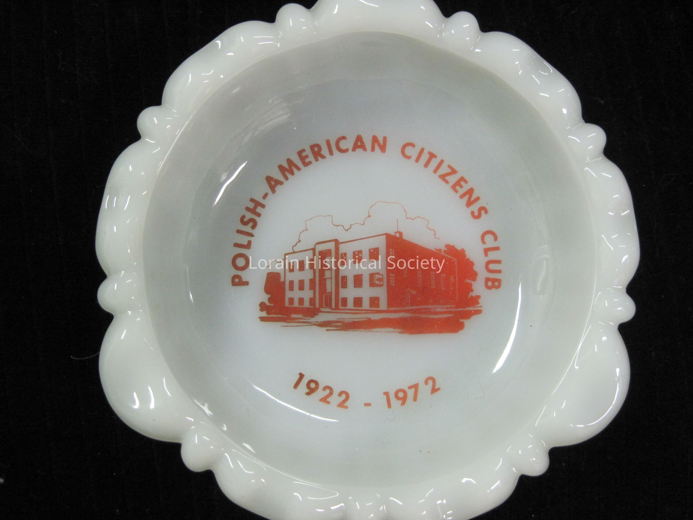 1 ash tray-memorabilia from the Polish-American Citizens Club, 1922-1972. White milk glass ash tray with red lettering and emblem of the Club building.Acquisition