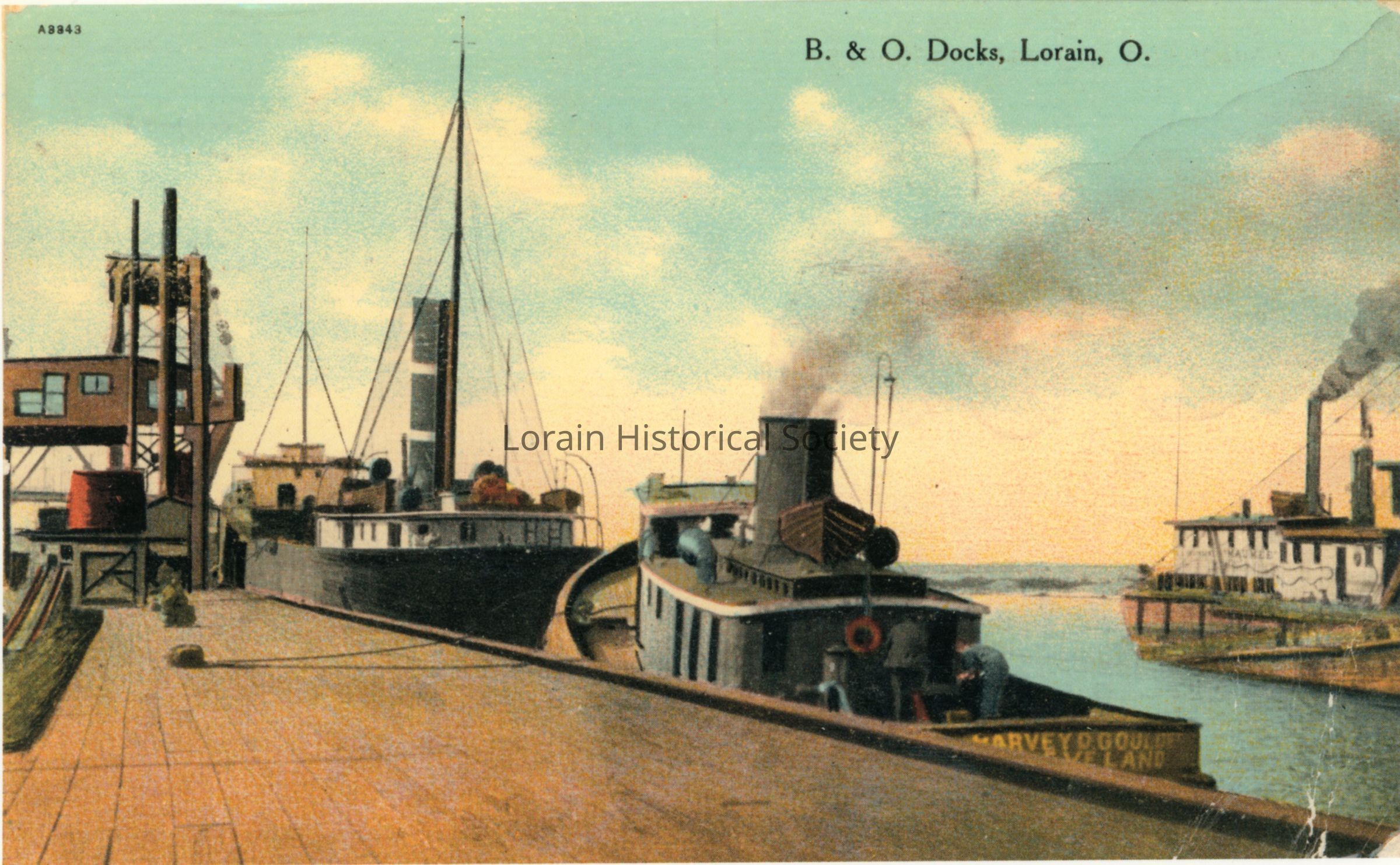 09/28/2022 AMS: dr0627014. Color Copy of Postcard is view of B & O Docks on Black River, Lorain Harbor. Postcard reads: "B & O Docks, Lorain, Ohio".