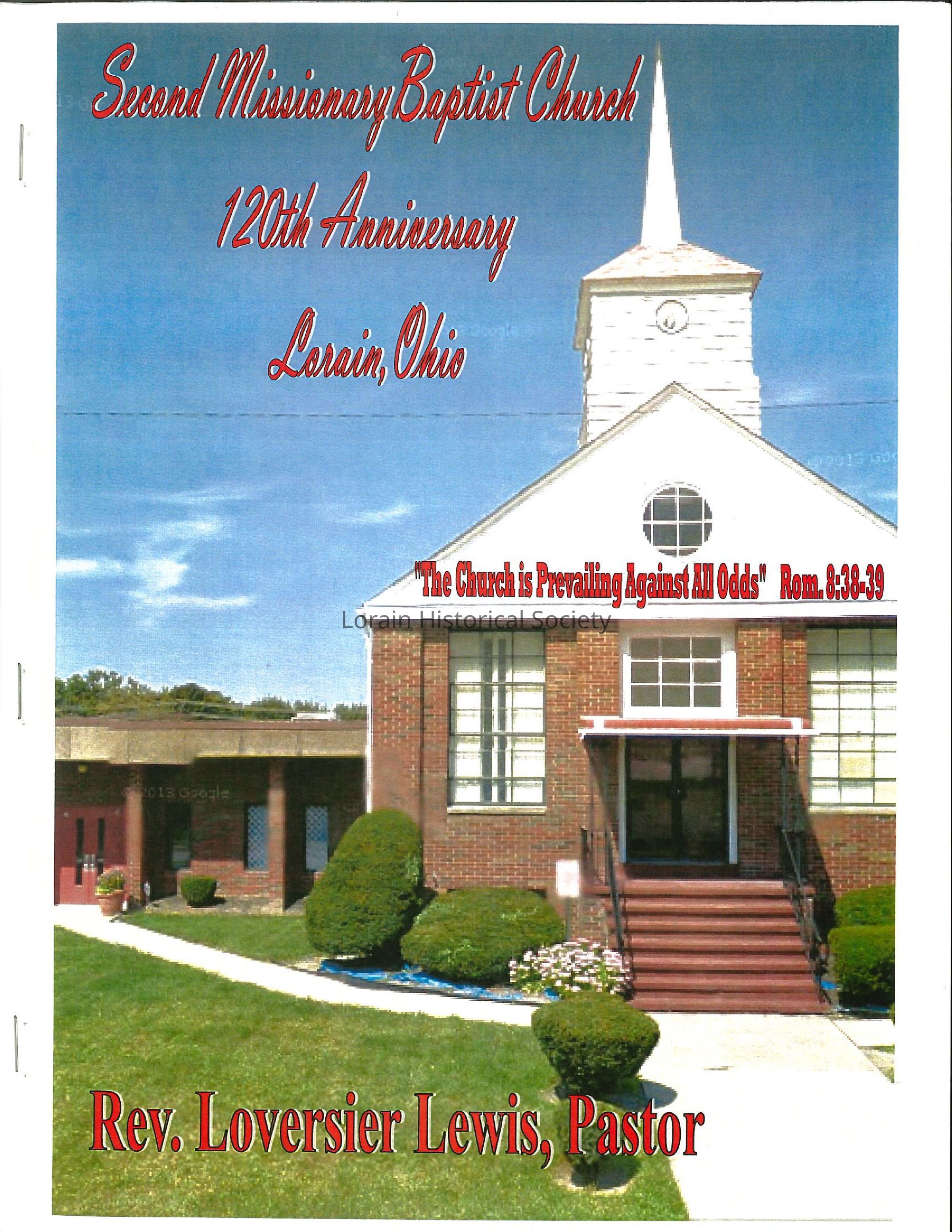 Second Baptist Church 120th Anniversary Booklet. Includes a history of the church; photos of members and groups, a list of former pastors, pictures of the current and old building, and a memorial to members who have passed.Acquisition