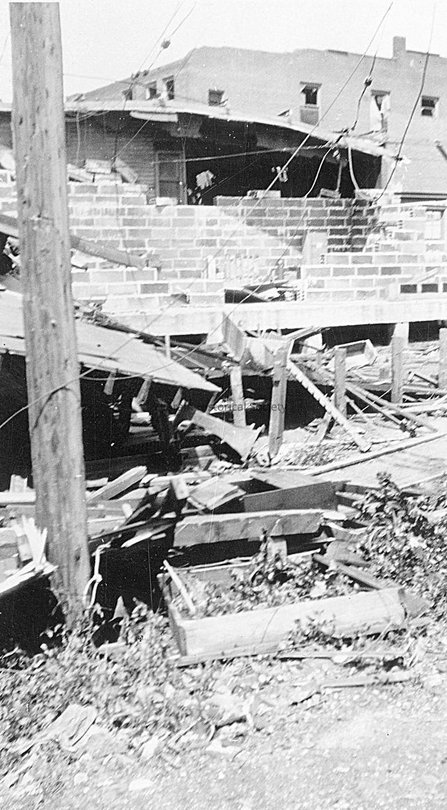 Photograph is black and white view of unidentified building showing damage, destruction and debris from 1924 Tornado.Acquisition
