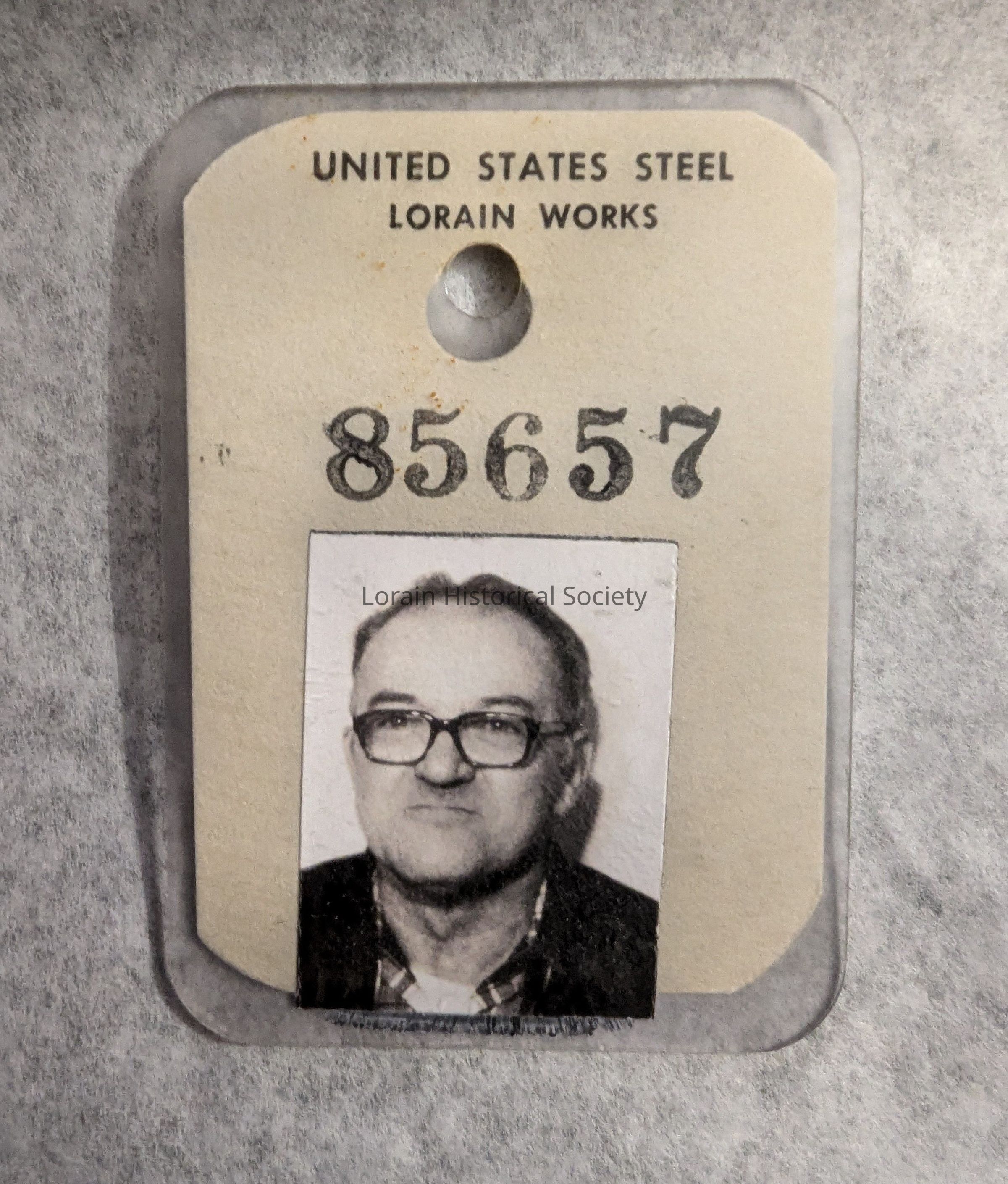 1.75 in x 2.5 in United States Steel Lorain Works employee badge belonging to Frank Severa, Jr ; black & white, number 85657Context