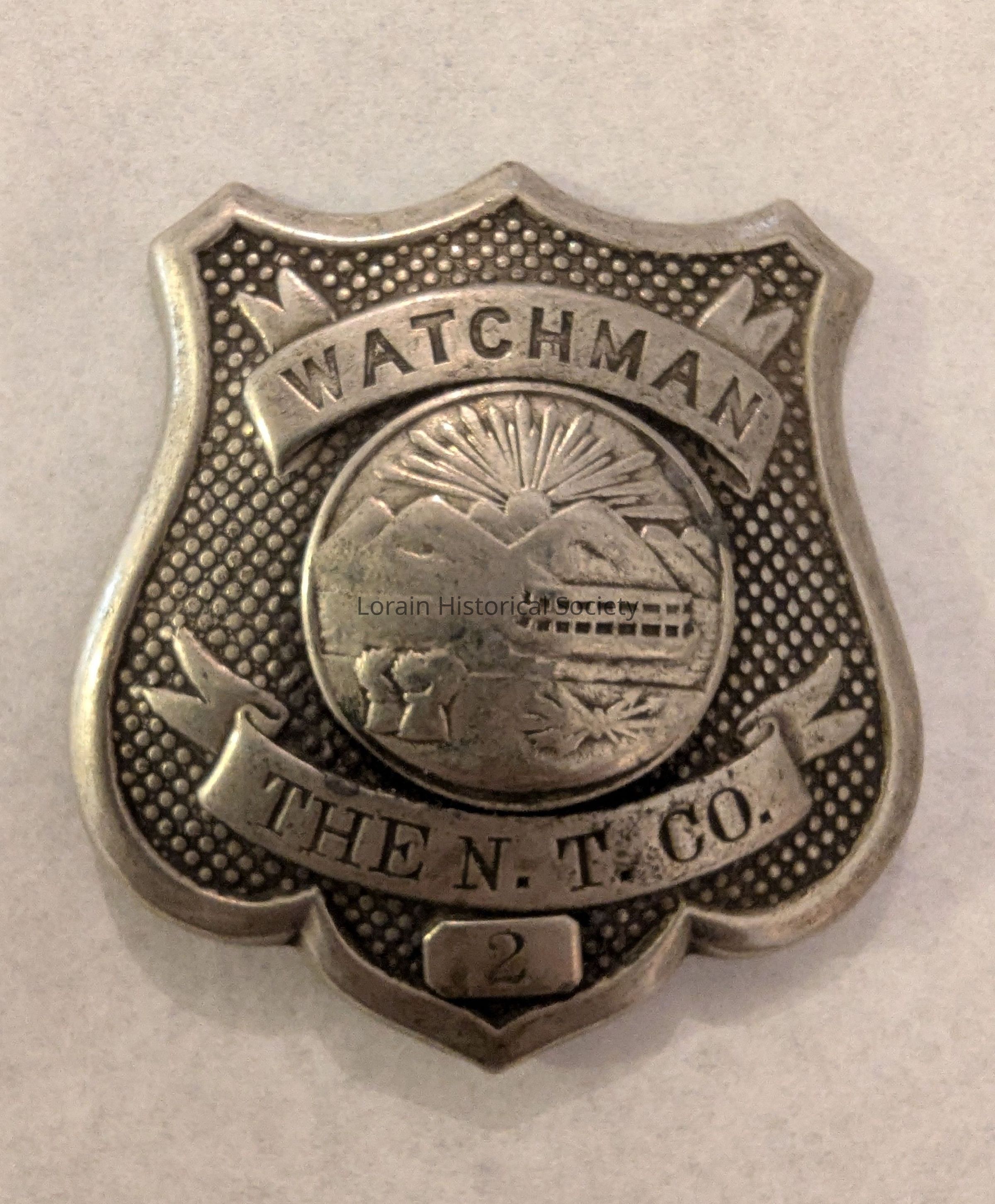 Metal badge in the shape of a fancy shield. The badge design has banners that read "Watchman" on top and "The N. T. Co." (National Tube Company) below and the number 2 on the very bottom. The center has the State Seal of Ohio.Collection