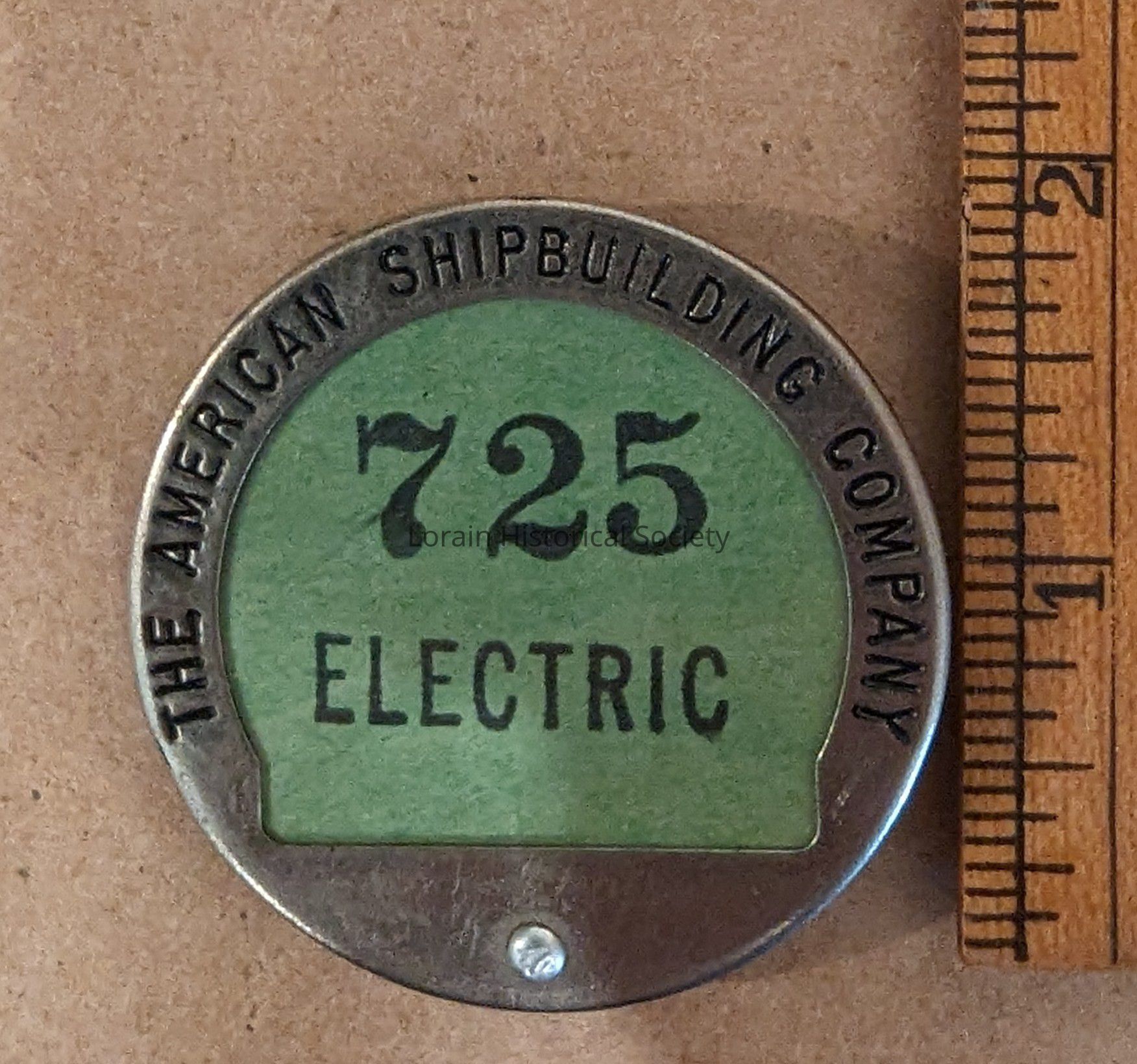 The American Shipbuilding Company employee badge; a metal badge/pin with an open center section, holding a stamped number and department (725 Electric) covered with a clear poly coating.Acquisition