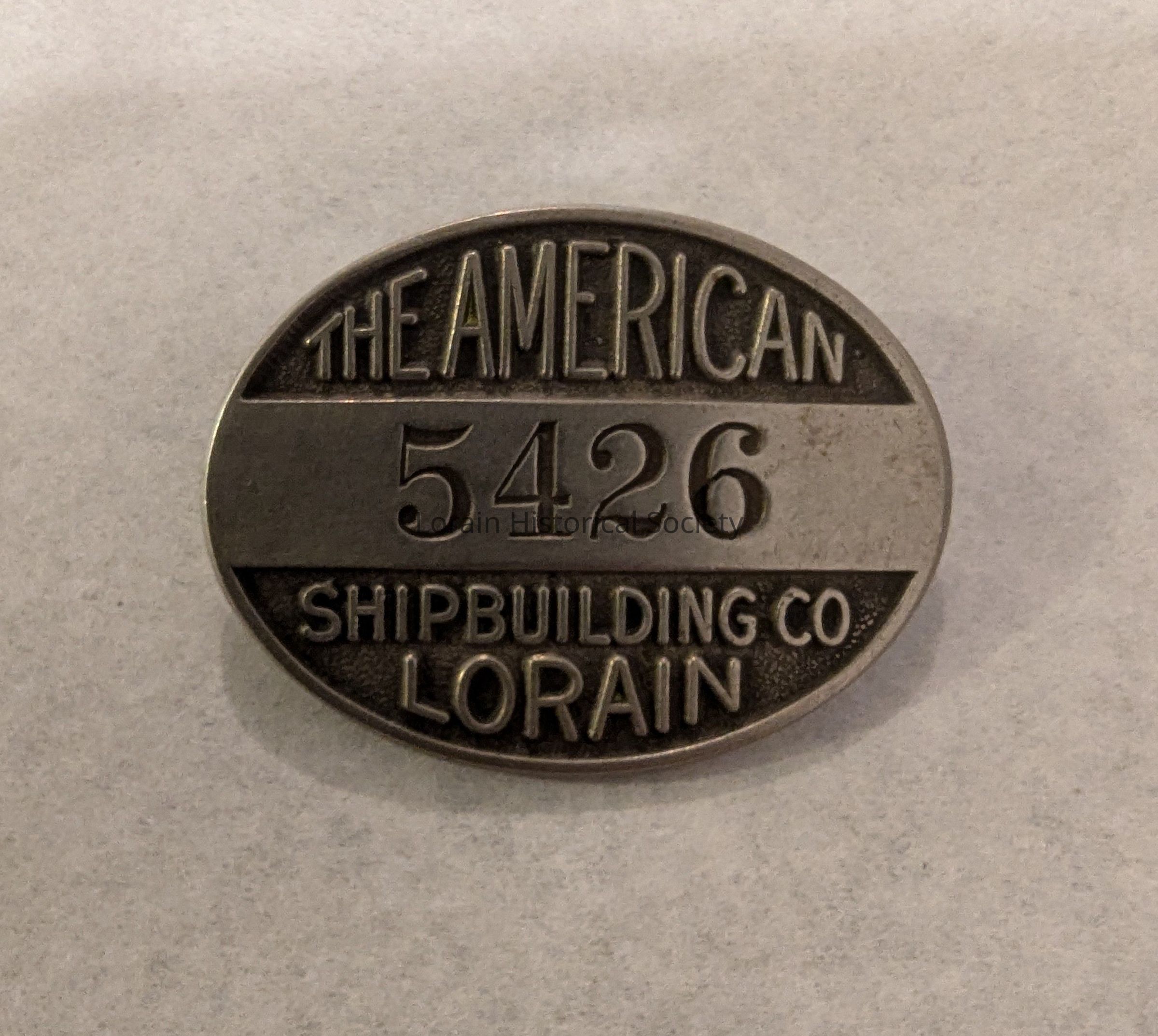 Metal, circular pin badge that reads "The American Ship Building Co Lorain" and an identification number of "5426".Collection