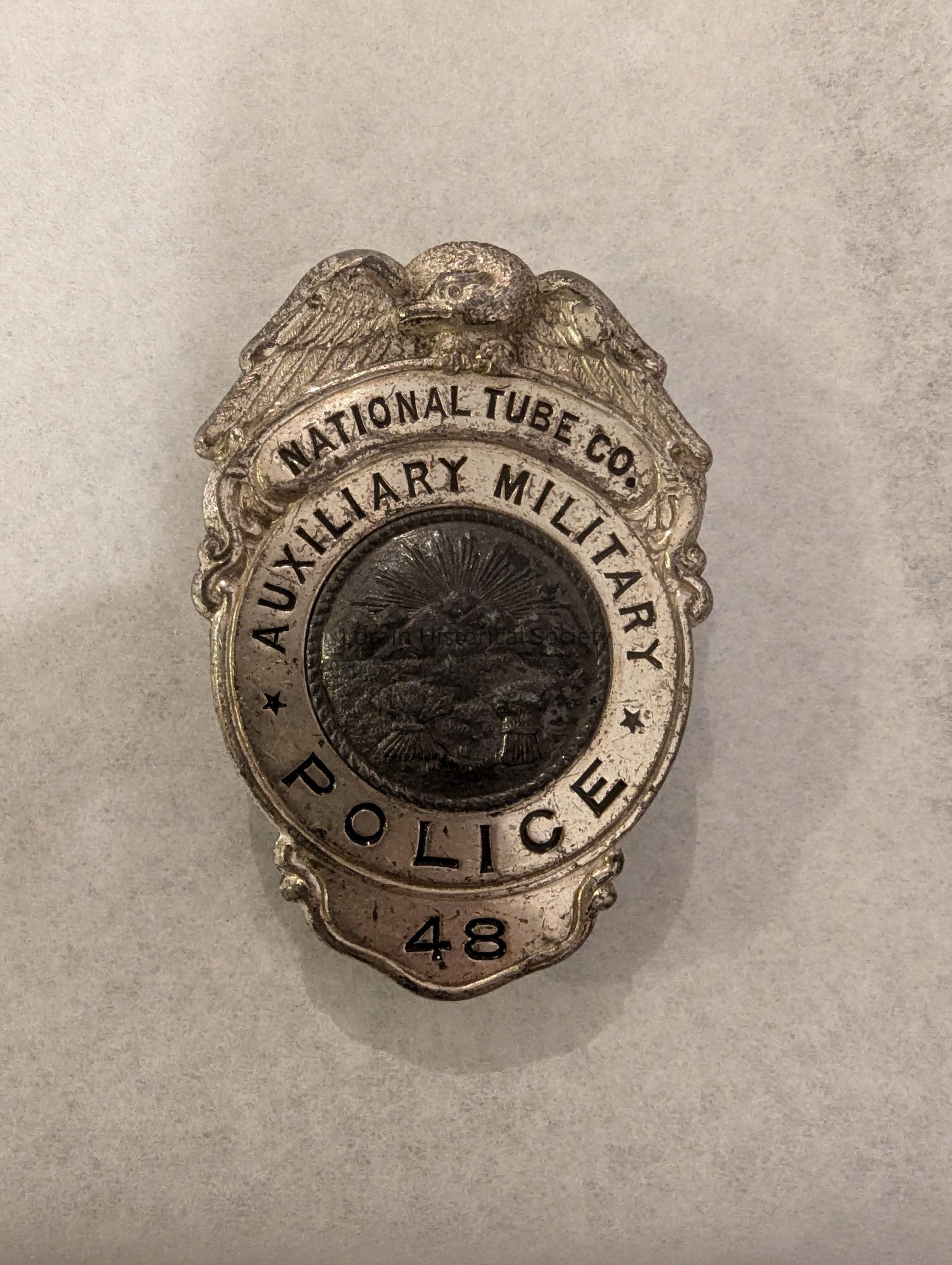 Badge that is oblong shaped. The center part is circular and reads "Auxillary Military Police" around the State Seal of Ohio. On the very top is an eagle with spread wings and right beneath that it reads "National Tube Co." On the bottom is the badge number, "48."Collection