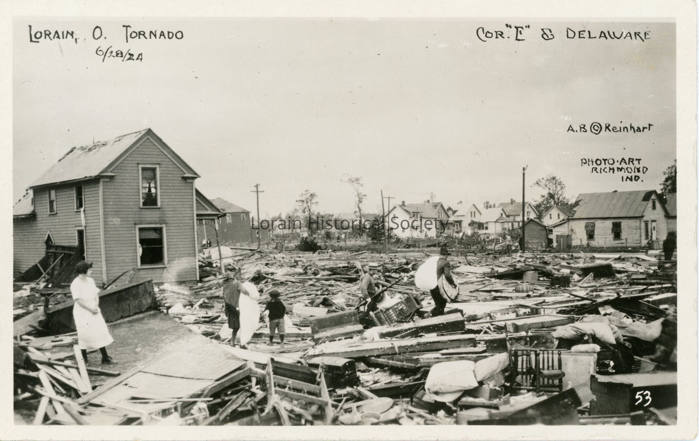 Postcard is view looking northwest from Delaware Avenue, near E Street with Florida Avenue and Georgia Avenue in the background, showing damage and destruction to unidentified houses after 1924 Tornado. Postcard reads: "LORAIN, O. TORNADO 6/28/24 COR. "E" & DELAWARE #53 A. B. REINHART PHOTO ART RICHMOND IND".Acquisition