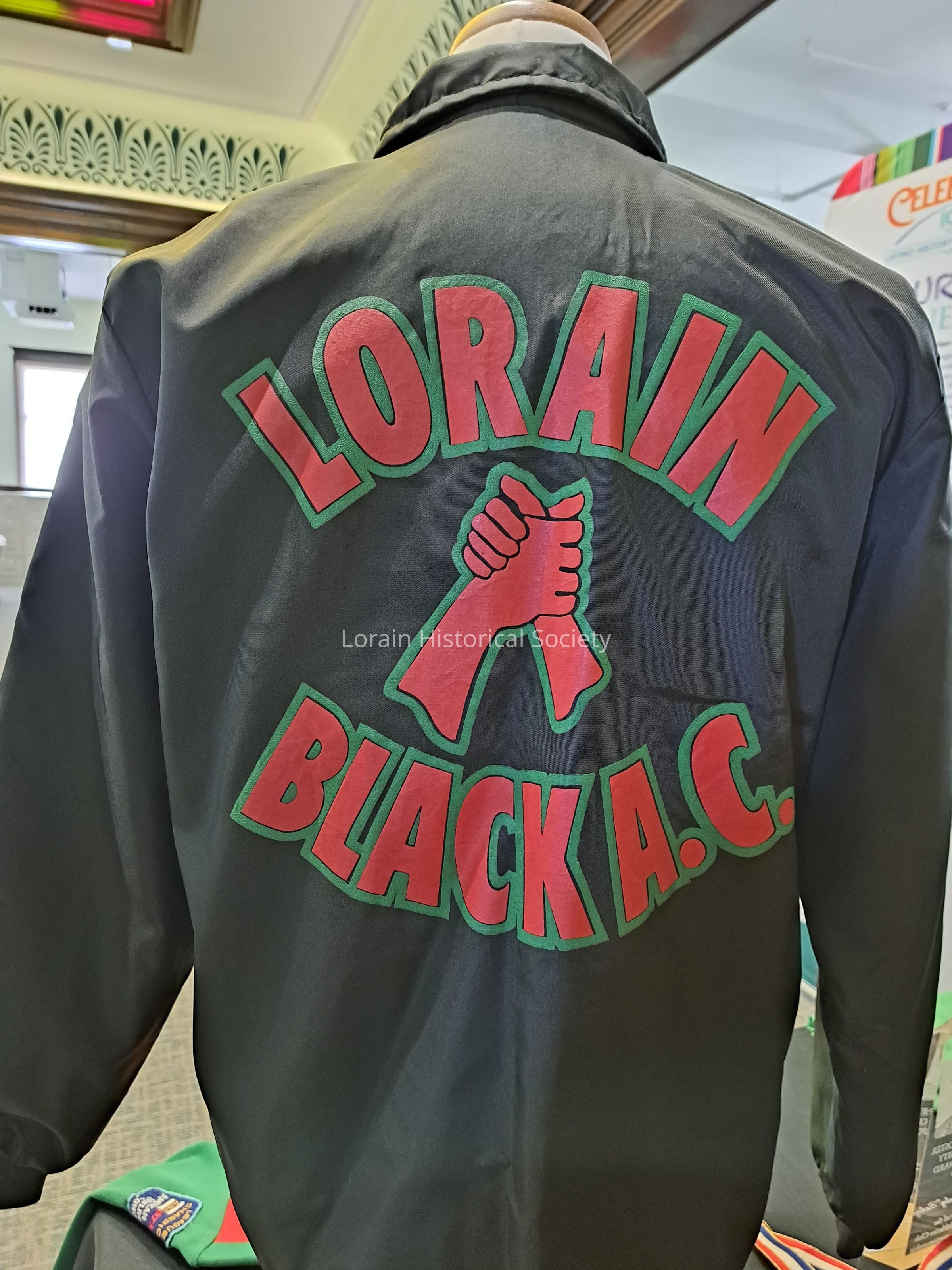 This black jacket belonged to Arthur Rodgers, Jr. (also known as Shoebooty or Bootie), who was a member of the Lorain Black Athletic Club ( "the Black ACs"). The jacket has a red & green club logo printed on the top front and a patch with the name "Bootie" sewn on the bottom front. The club logo is also printed on the back. The Black Athletic Club was founded in 1972.Collection