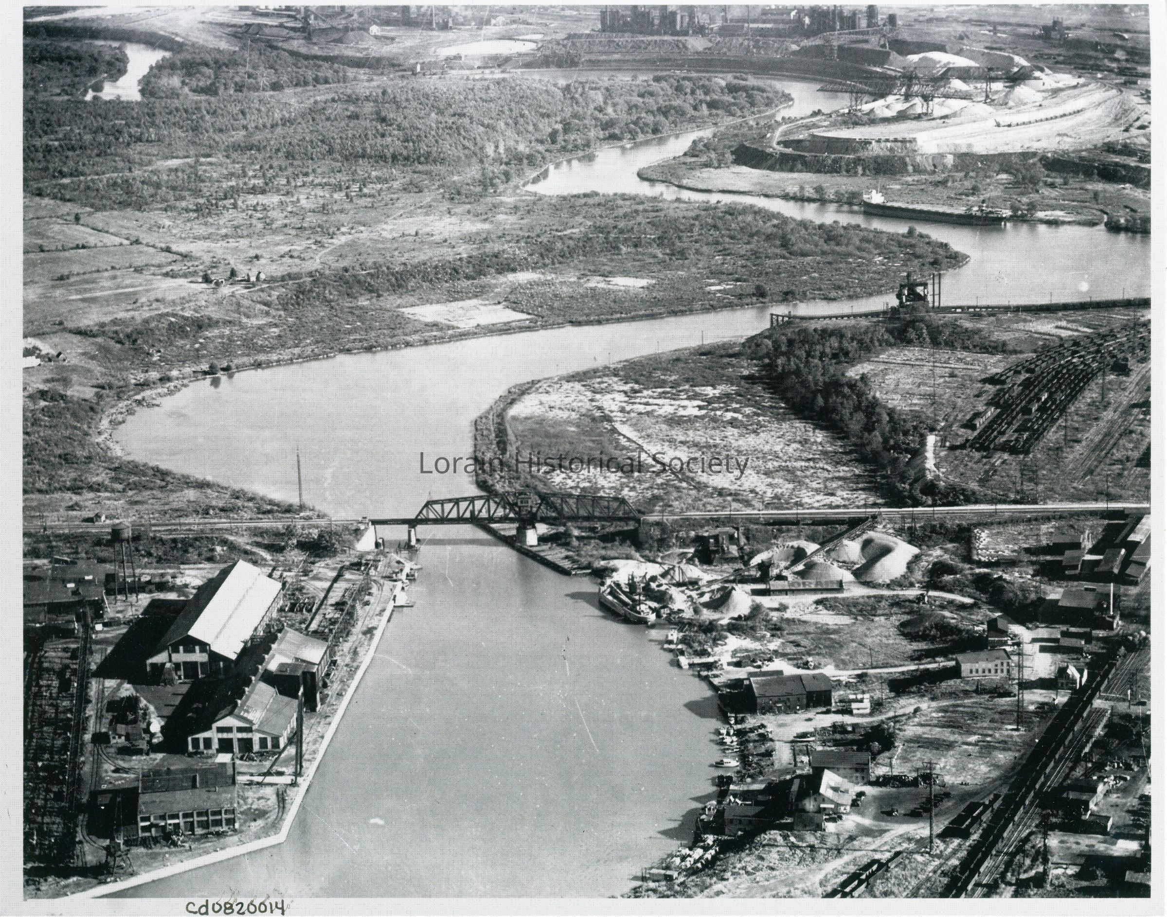 Black River circa 1940s with view of Nickelplate railroad bridge, B&O railroad, and steel mill in distance. Bad photocopy scan.
