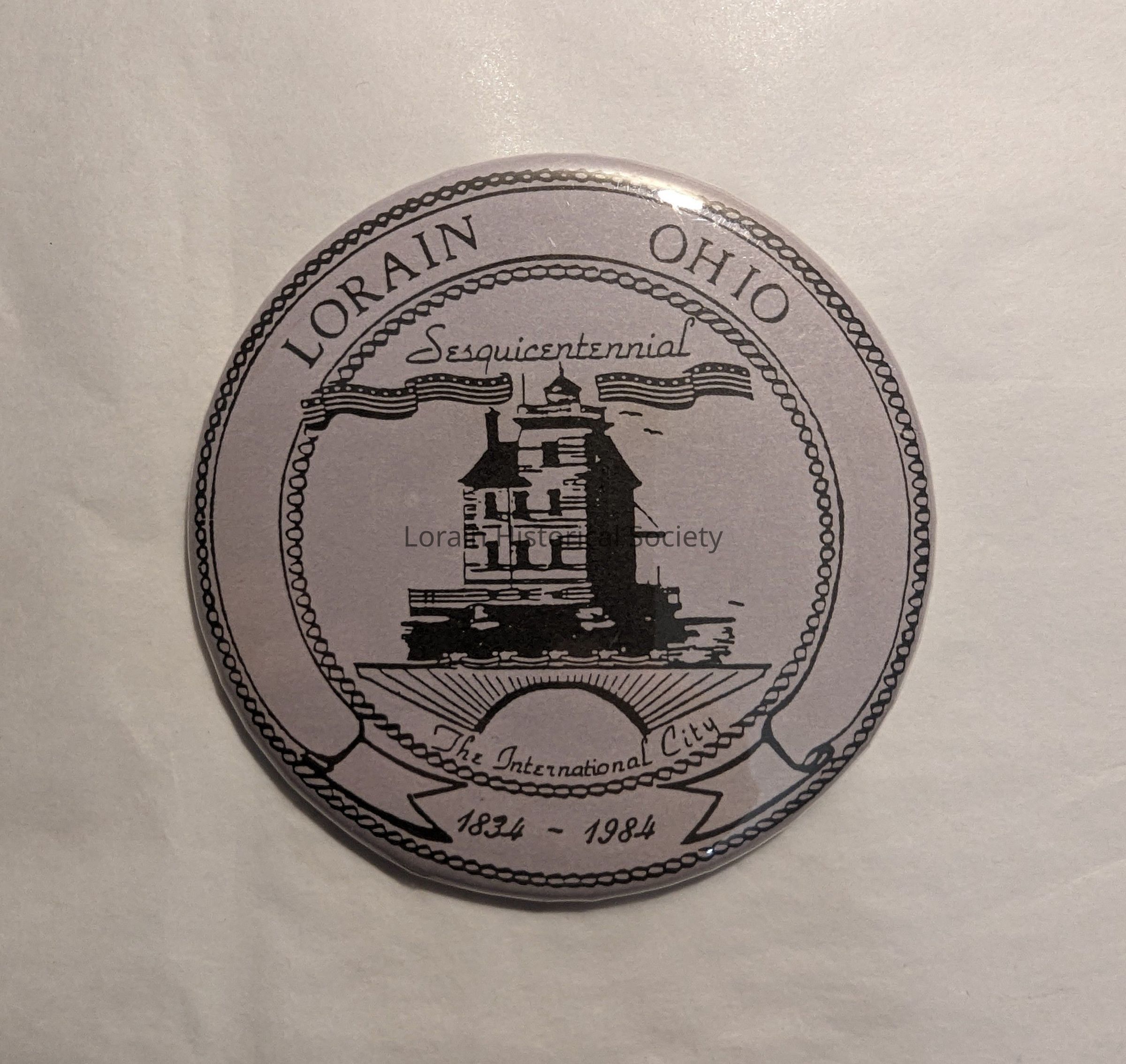 The button or pin is circular and quite big. It has a purple background and is made of plastic and metal. In black lettering it reads, "Lorain Ohio Sesquicentennial The International City 1834 - 1984". The background on the front also has a black sketch of the Lorain lighthouse on it.Acquisition