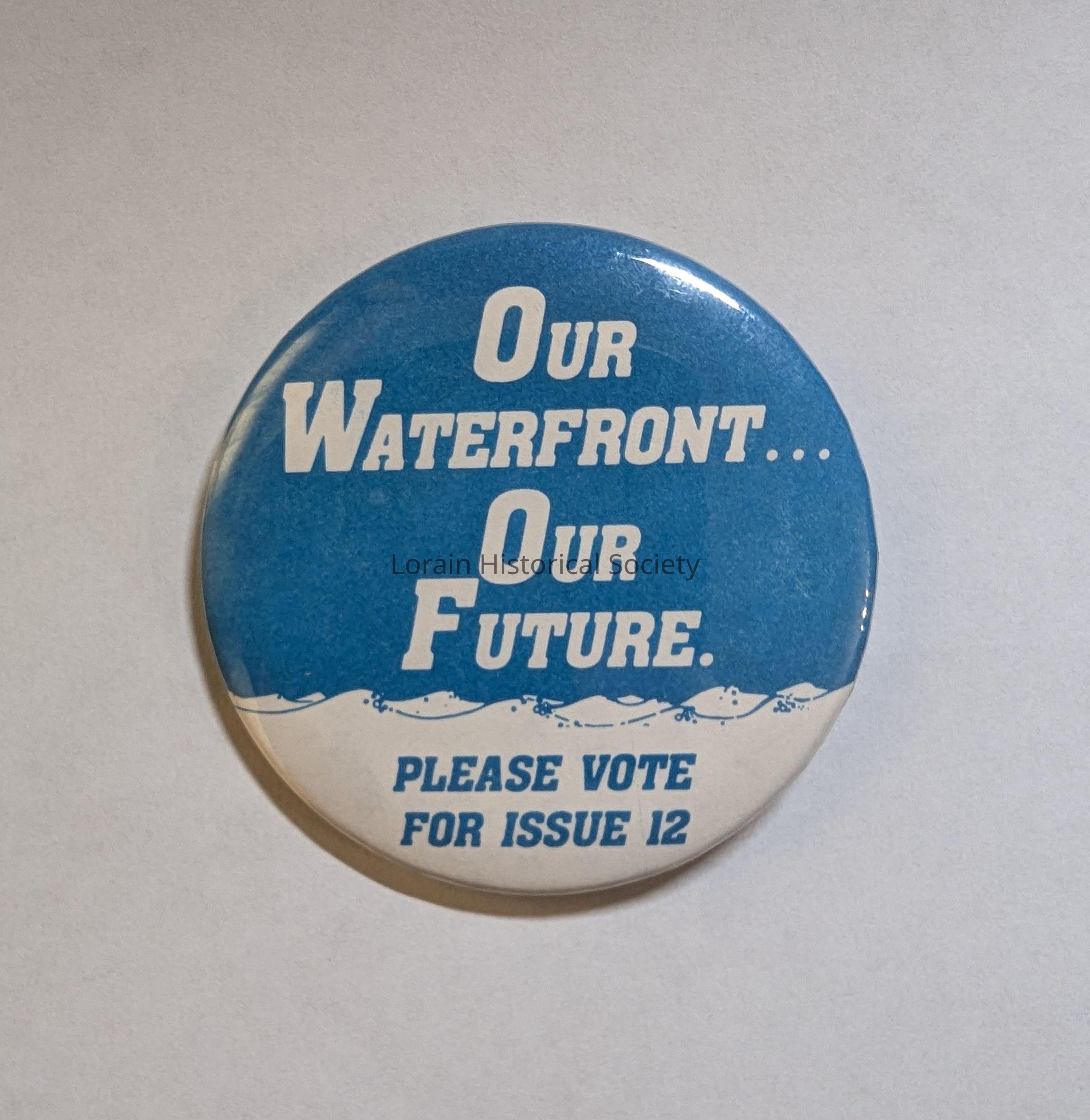 Pin-back, blue and white - Our Waterfront...Our Future - Please vote for Issue 12