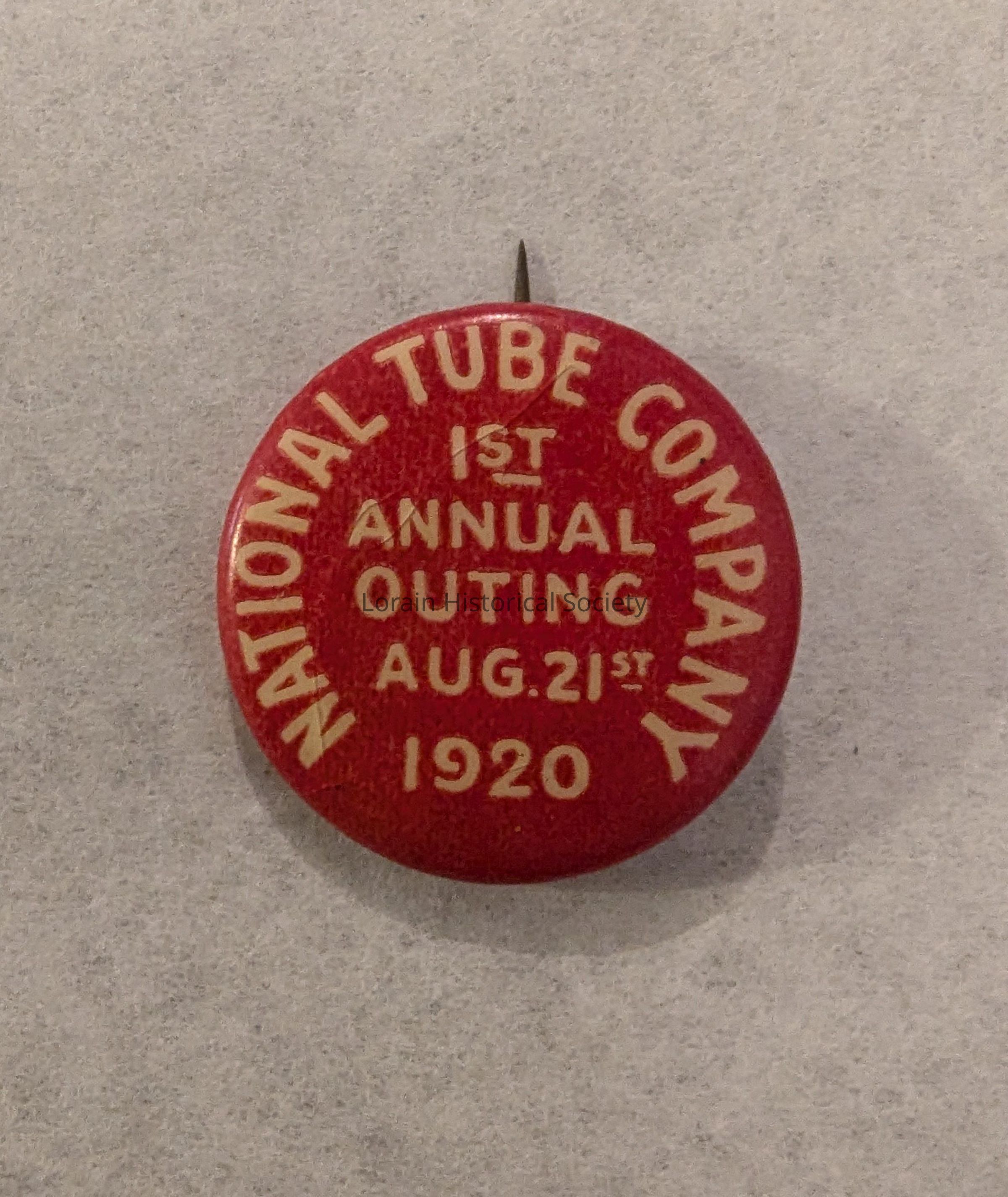 Small red circle-shaped pin that reads "National Tube Company" (text is wrapped around the edge of the circular pin) and in the center of the pin reads "1st Annual Outing August 21st 1920".