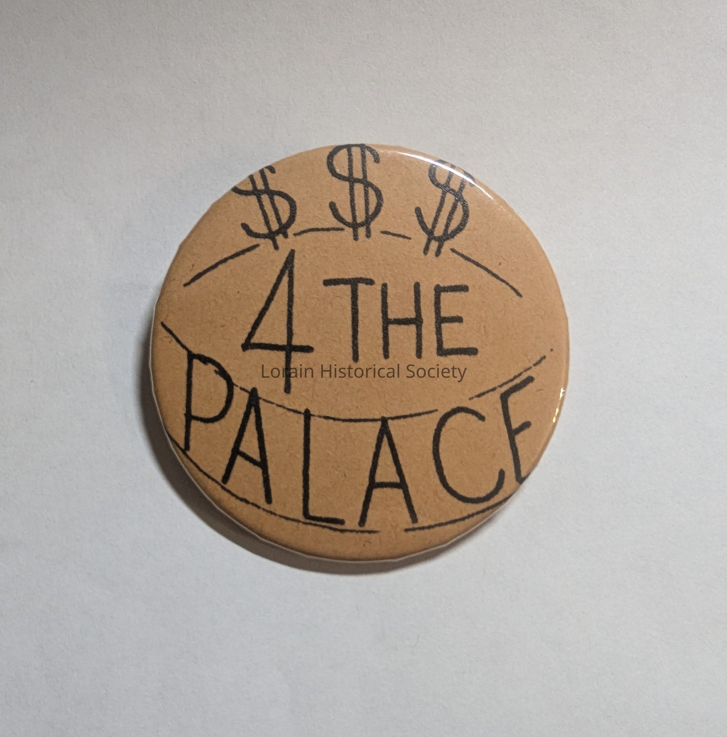 Pin-back, tan with black lettering; campaign in support of raising money to save the Palace Theatre - "$$$ 4 THE PALACE"