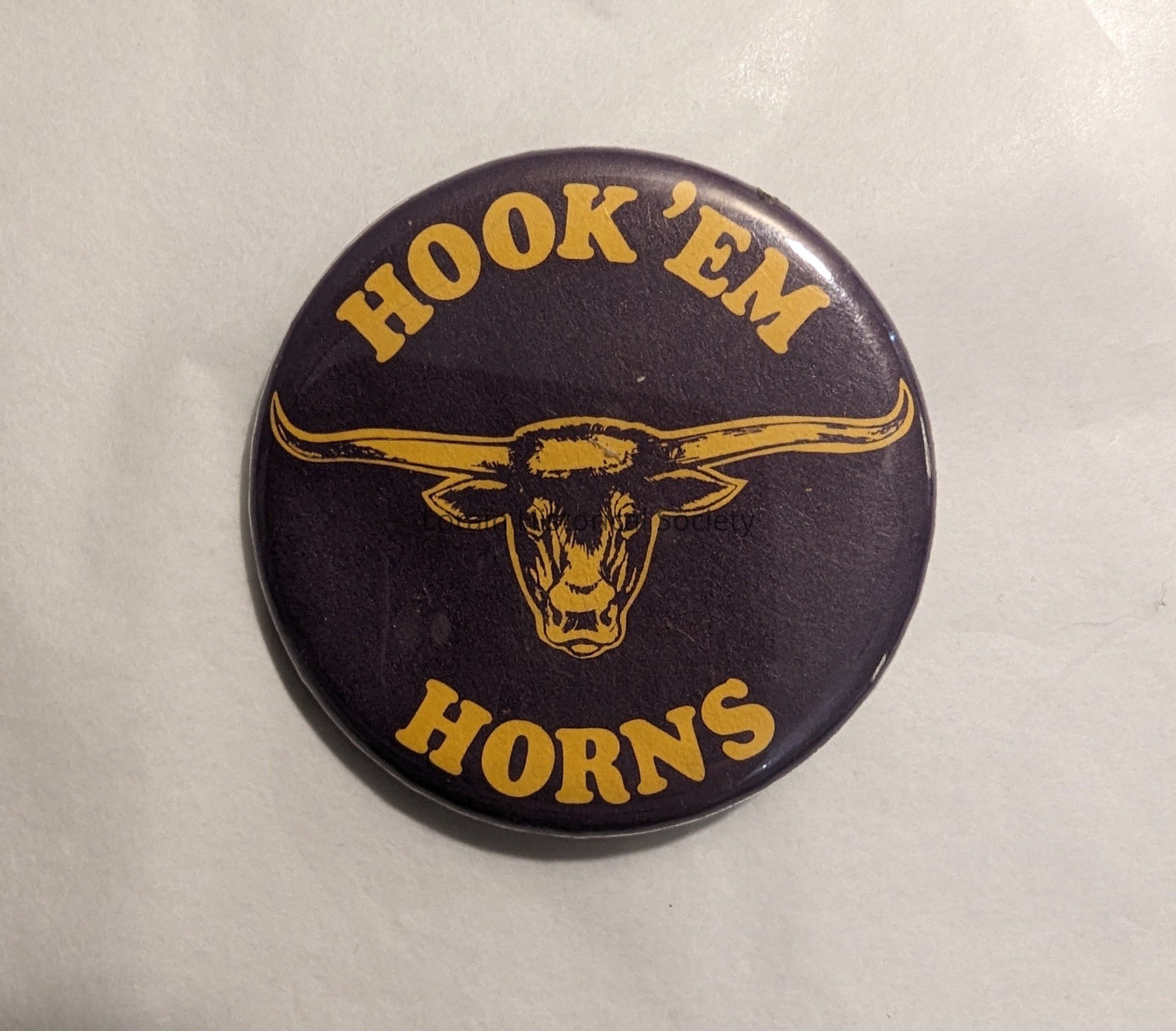 Pin-back; purple with yellow lettering and graphic of a longhorn steer -mascot of Longfellow Junior High School; "Hook 'em Horns"Acquisition