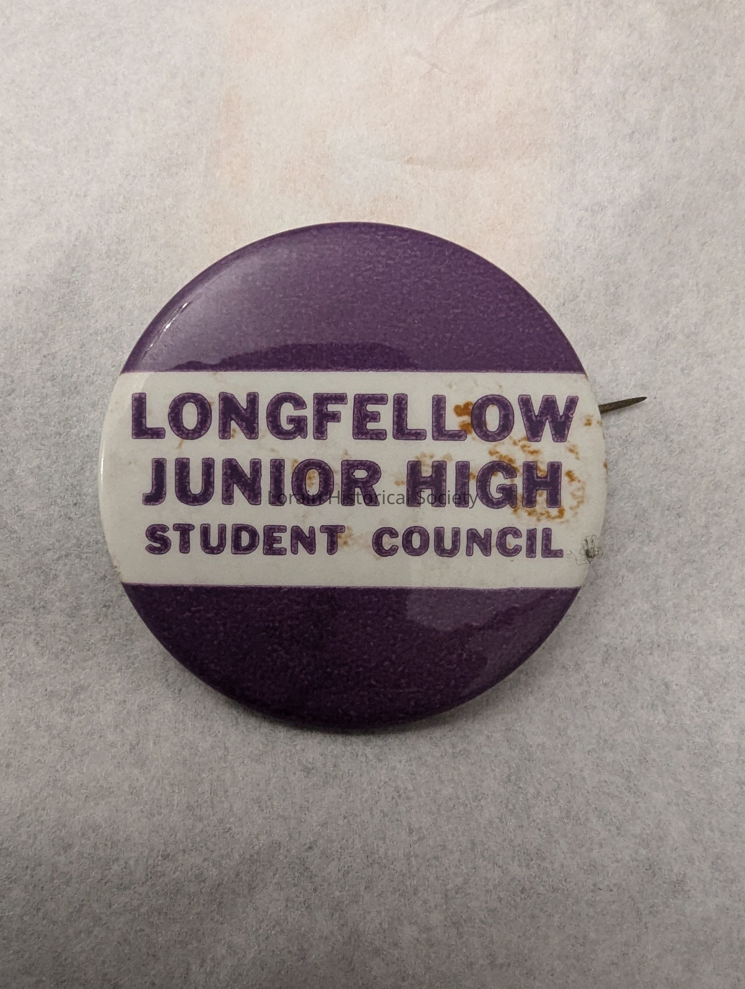 One pin-back; Longfellow Junior High Student Council; purple and white One small purple plastic; pennant shaped; yellow lettering - Longhorns