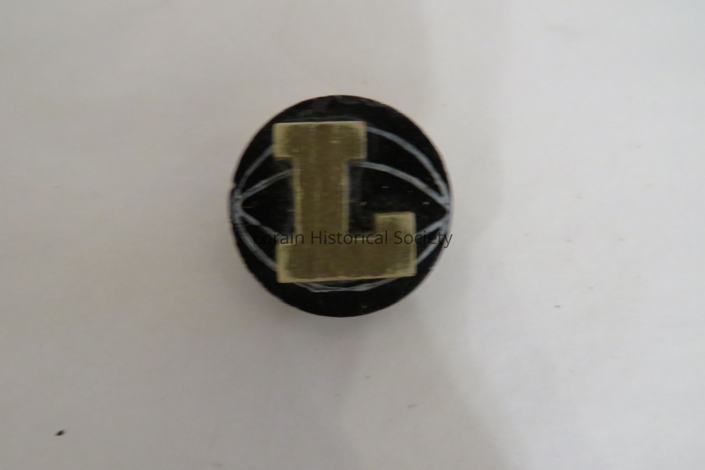 Button, pin back, wooden basketball with the letter "L" attached