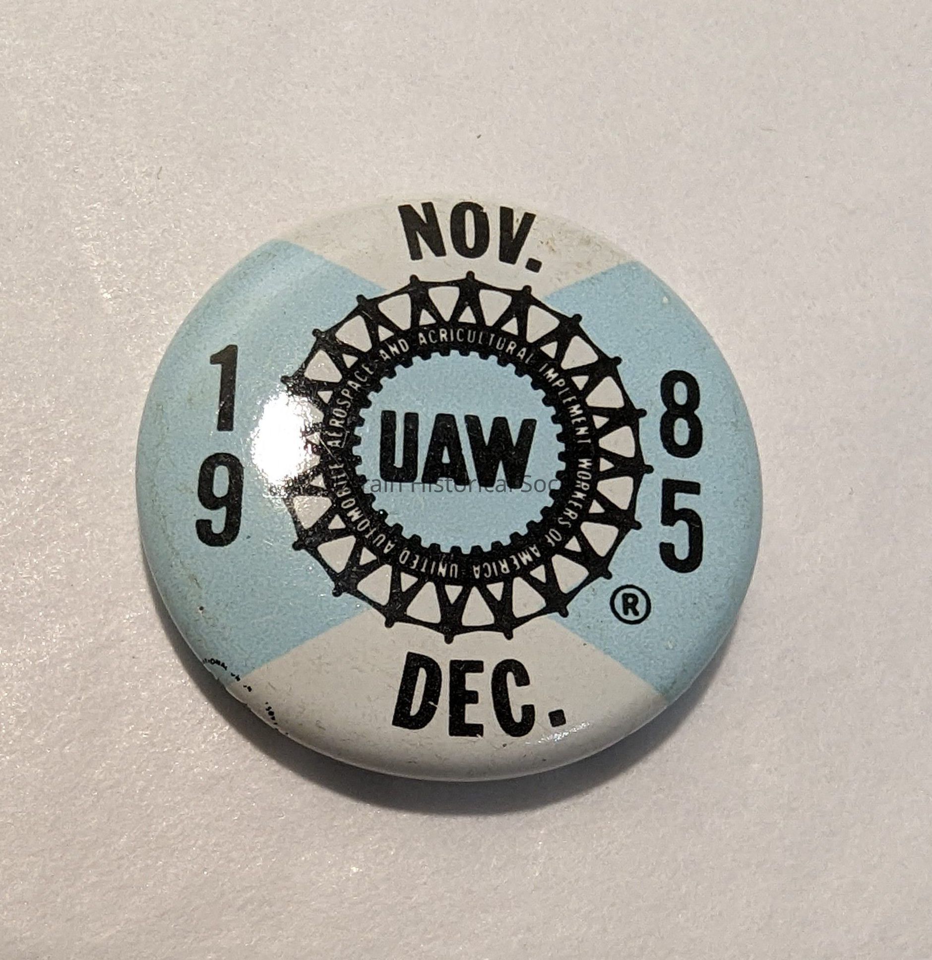 Pin-back; pale blue and white with black lettering and graphic; UAW (United Automotive Aerospace and Agricultural Implement Workers of America; Nov. - Dec. 1985Acquisition
