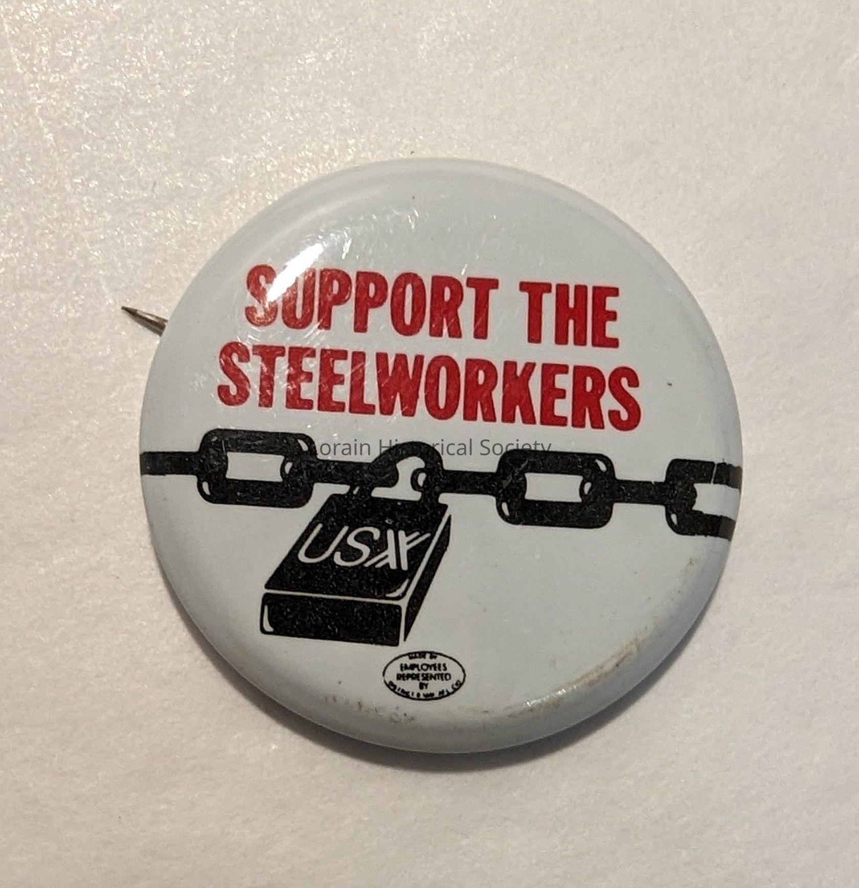 Pin-back; white with red lettering "Support the Steelworkers"; black graphics of chain and padlock with USX on it, signifying strengthAcquisition