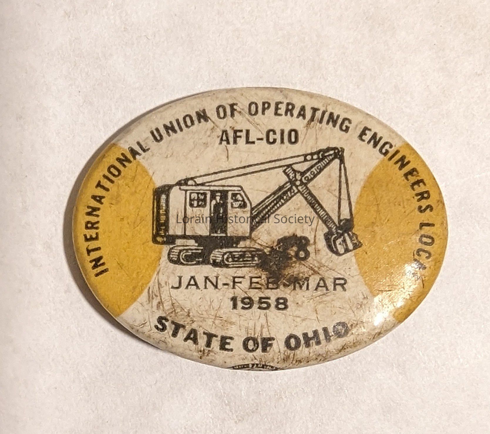Small yellow and white pinback button; International Union of Operating Engineers Local 18; Jan-Feb-Mar 1958; State of Ohio; Thew Shovel.