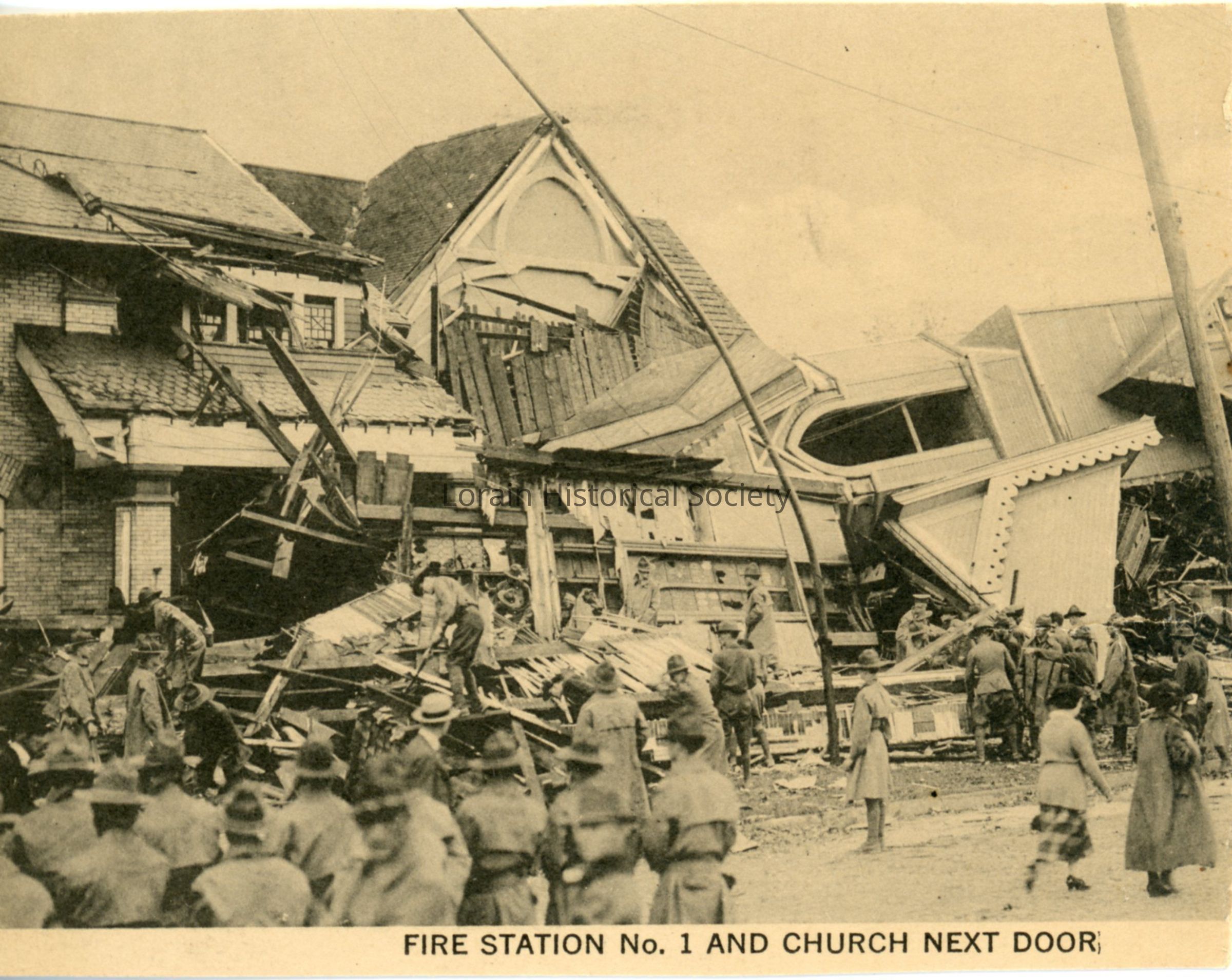 Postcard print is view of Fire Station No. 1, 605 West Fourth Street, with steeple of First Congregational Church that toppled over on it during the 1924 Tornado. Postcard print reads: "FIRE STATION NO.1 AND CHURCH NEXT DOOR".Acquisition