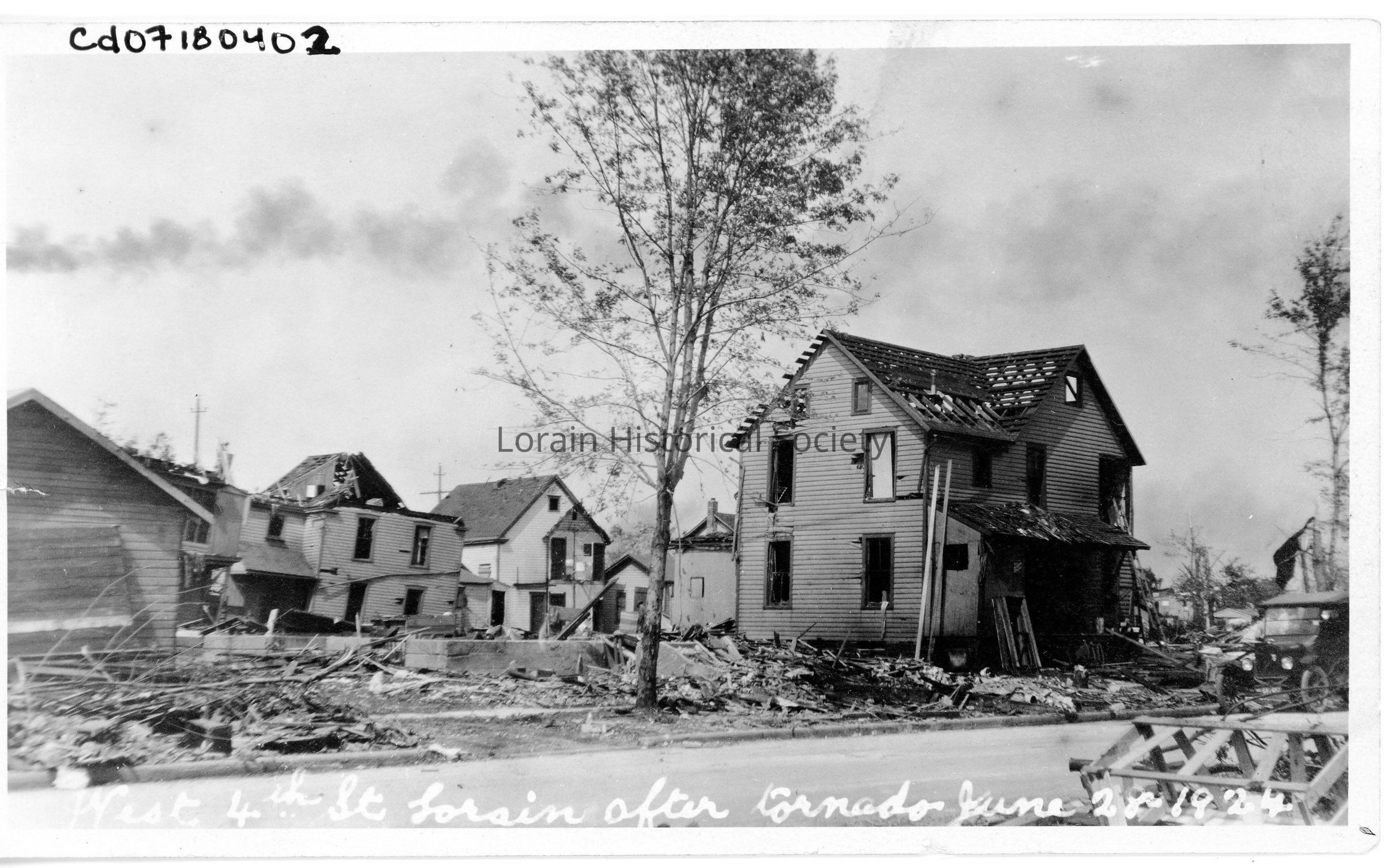 Photograph is black and white view of homes on West Erie Avenue and West Fourth Street showing damage and destruction from 1924 Tornado. L to R: 1031 West Erie Avenue, Charles C. Ellis Home; 1027 West Erie Avenue, Grace and Frank Klaer Home; 1019 West Erie Avenue, Eva and Albert Smith Home; 1026 West Fourth Street, Mrs. Ida Jaycox Home (in foreground).Acquisition