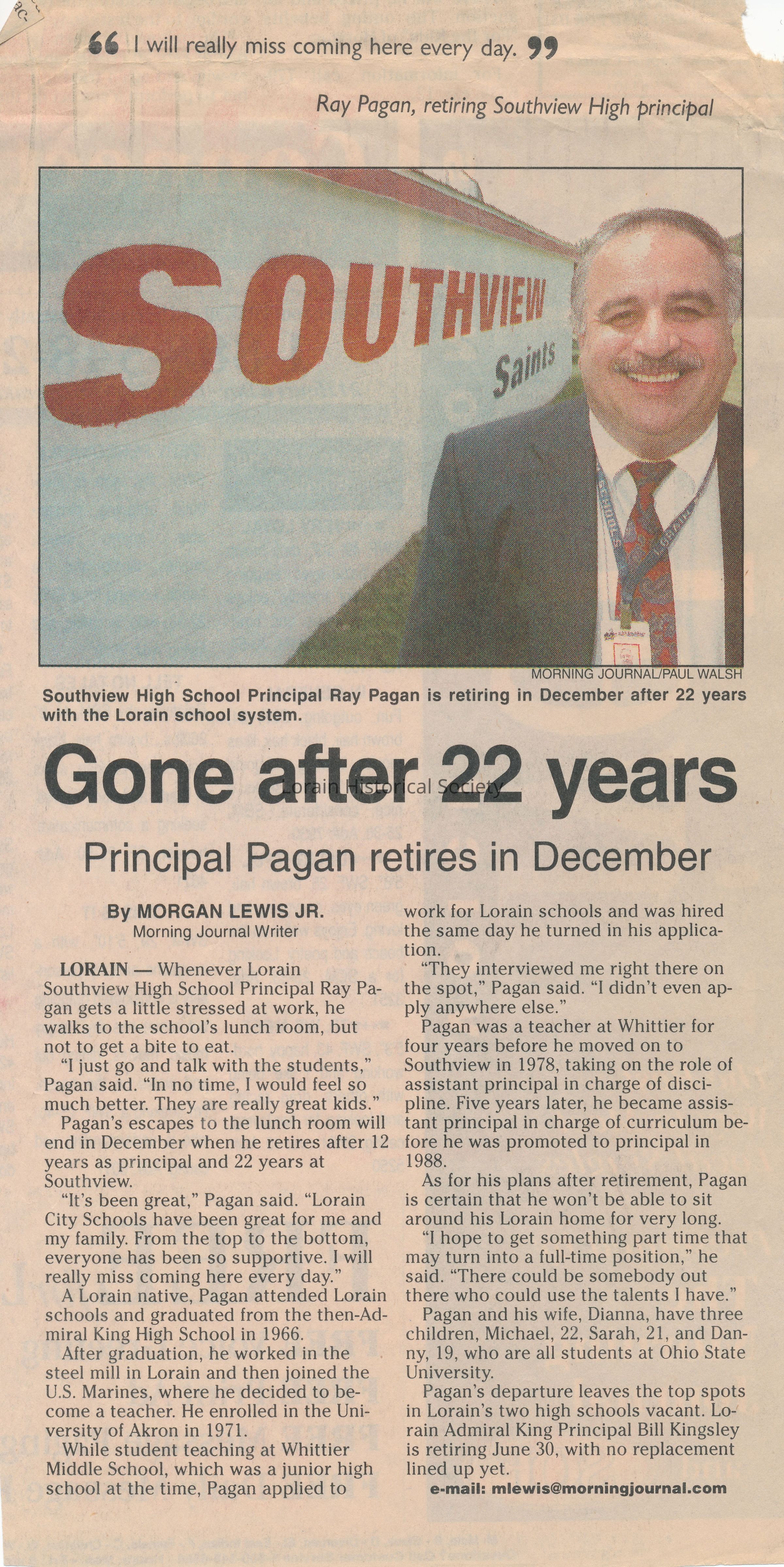 Newspaper article from The Morning Journal announcing Ray Pagán's retirement from his position as principal of Southview High School in Lorain, Ohio.Collection