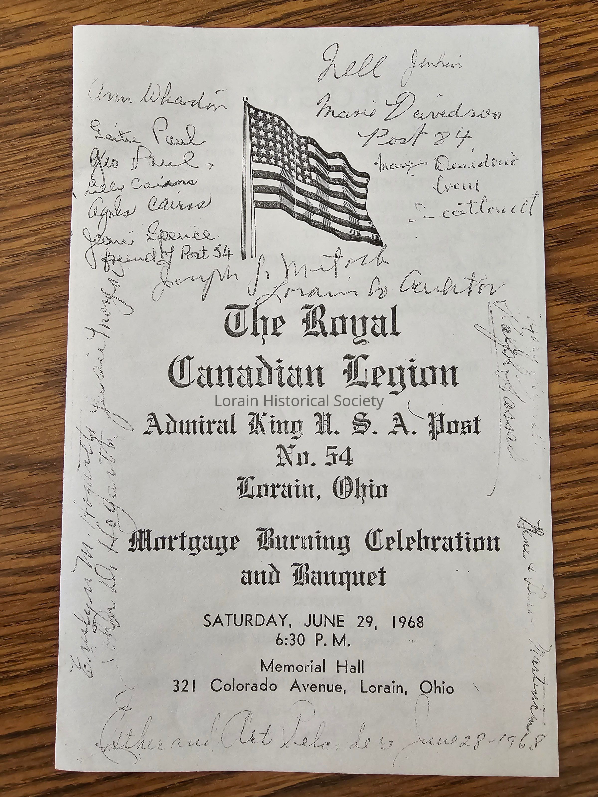 The Royal Canadian Legion Admiral King U.S.A. Post No. 54 Lorain, Ohio / Mortgage Burning Celebration and Banquet at Memorial Hall, 321 Colorado Ave. (photocopy)