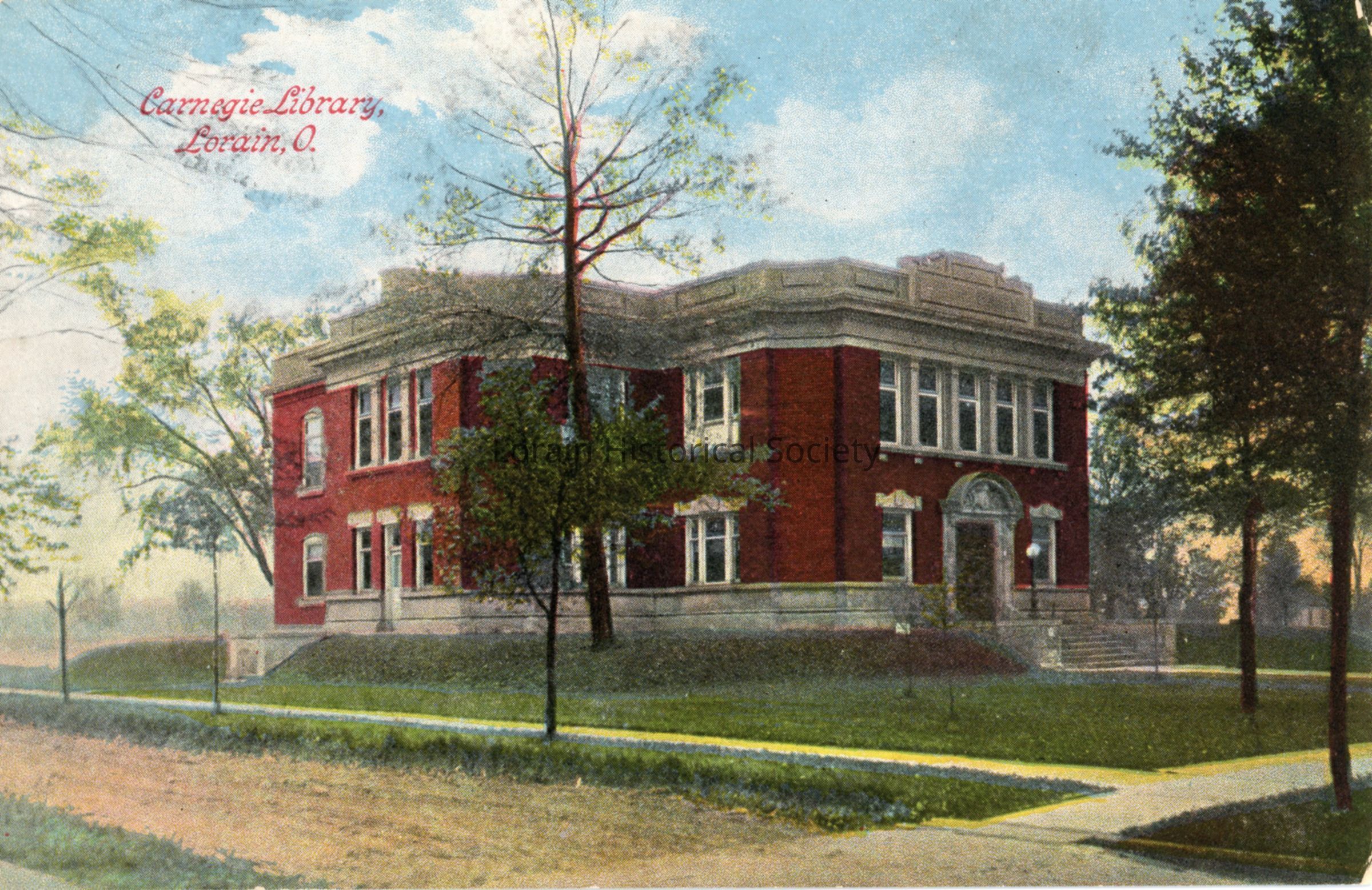 10/10/2022 AMS: Color postcard is side and front view of Carnegie Library. Postcard reads: "Carnegie Library Lorain, O.".