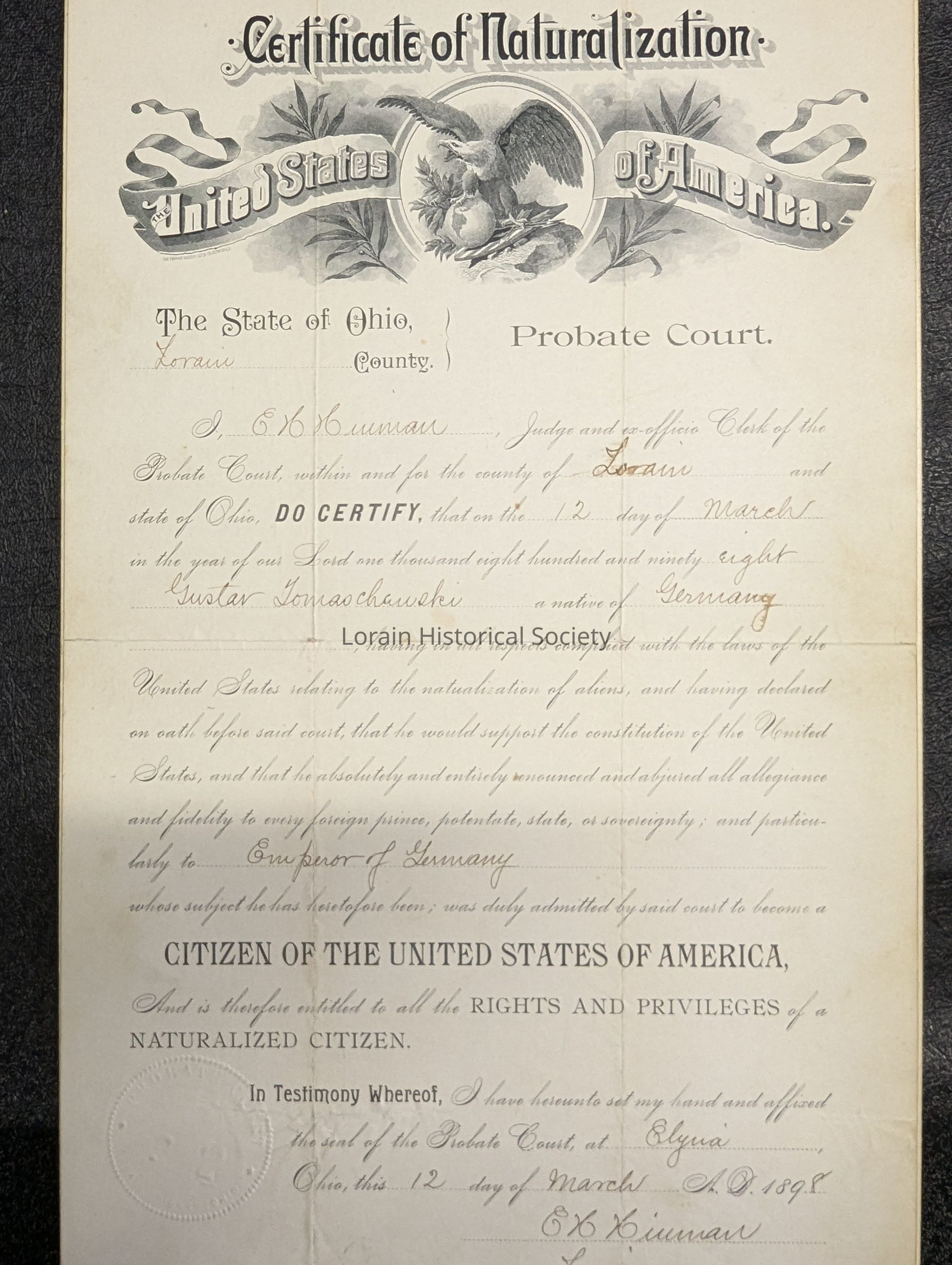 Certificate of Naturalization "Gustav Tomaschawski" 1898 - Grandfather of Joan Ernst.