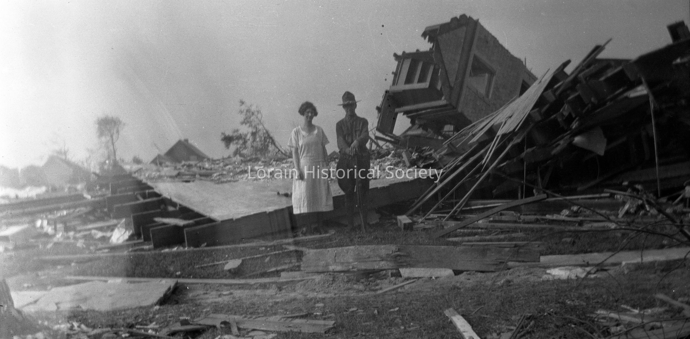 A woman and man (who is dressed like a Ohio National Guard member) stand together by wreckage.Acquisition