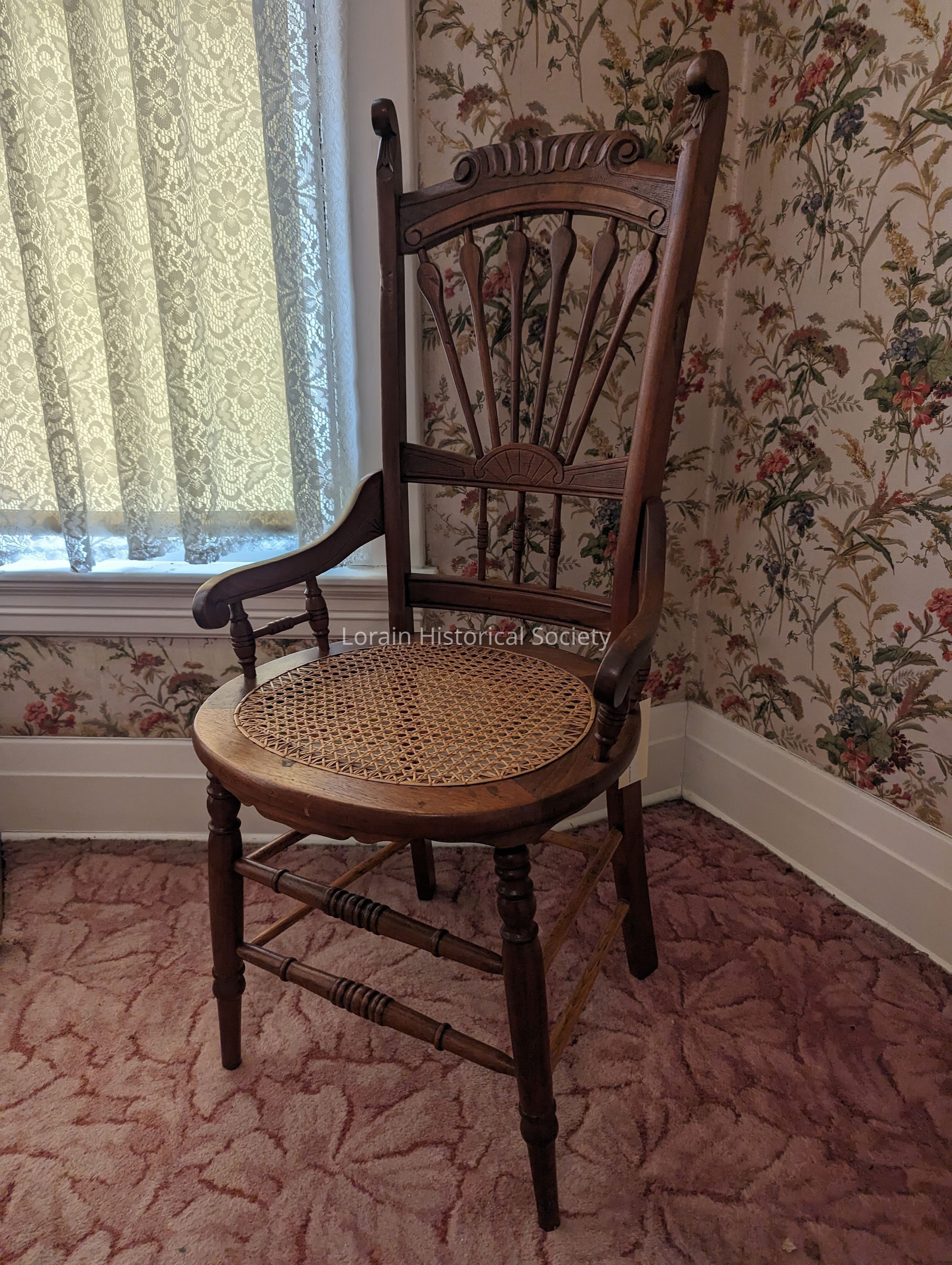A straight back wooden chair with a cane seat. Salvaged from the Evangelical United Brethren Church which was destroyed by the 1924 tornado. Only two choir chairs and a bell were salvaged, this chair being one of them.Context