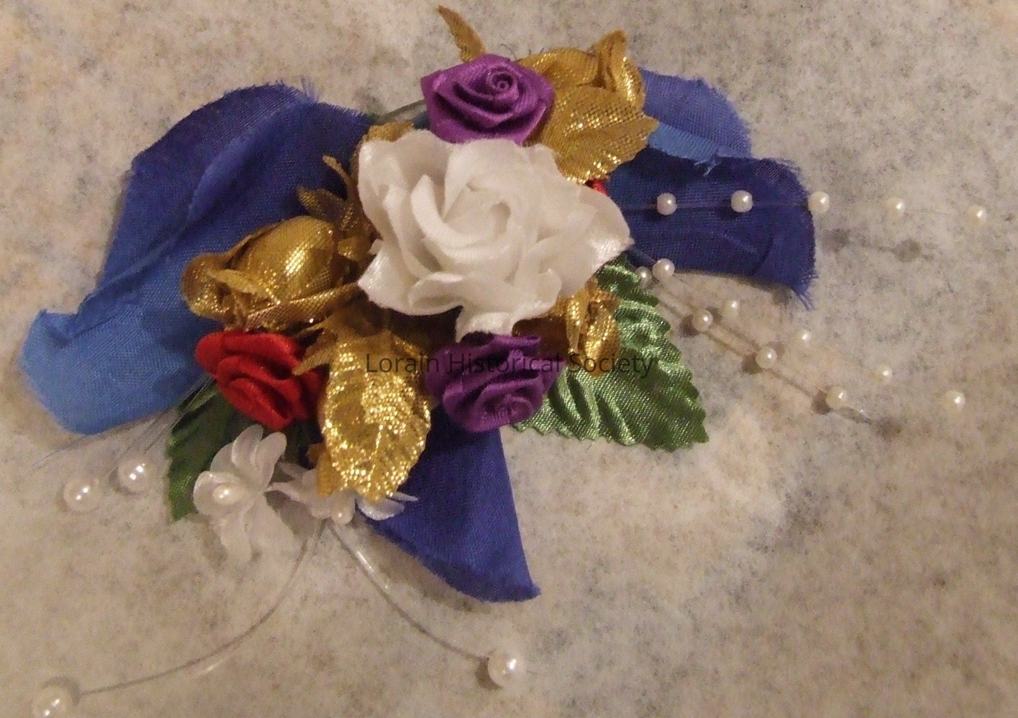 A silver metal hair clasp with blue petals, green leaves and small purple, red, white and gold roses attached; several sprigs with white pearl-like beads also are attached. This is part of an ethnic Croatian womens' dress/outfit.Acquisition
