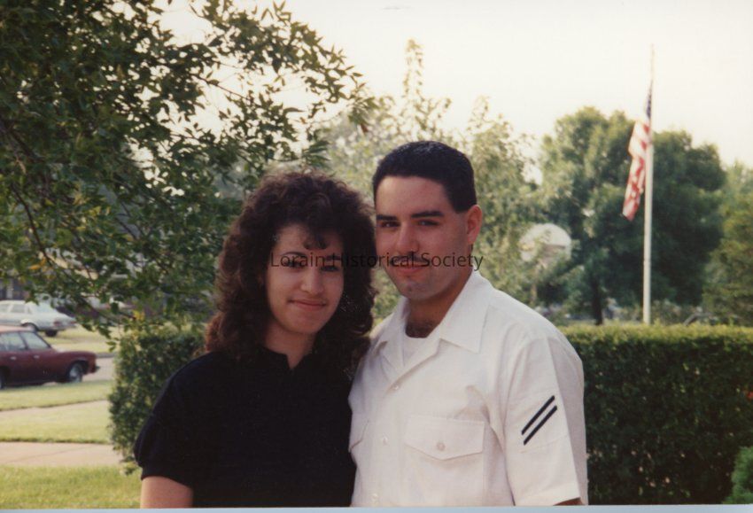 Photo of Cynthia (left) and Victor Ortiz (right) taken at Cynthia's house in Lorain, Ohio in late summer of 1990. Vic is in uniform. This photo was taken after Vic completed boot camp for the U.S. Navy. Cynthia and Vic got engaged after Vic's return from boot camp.Collection