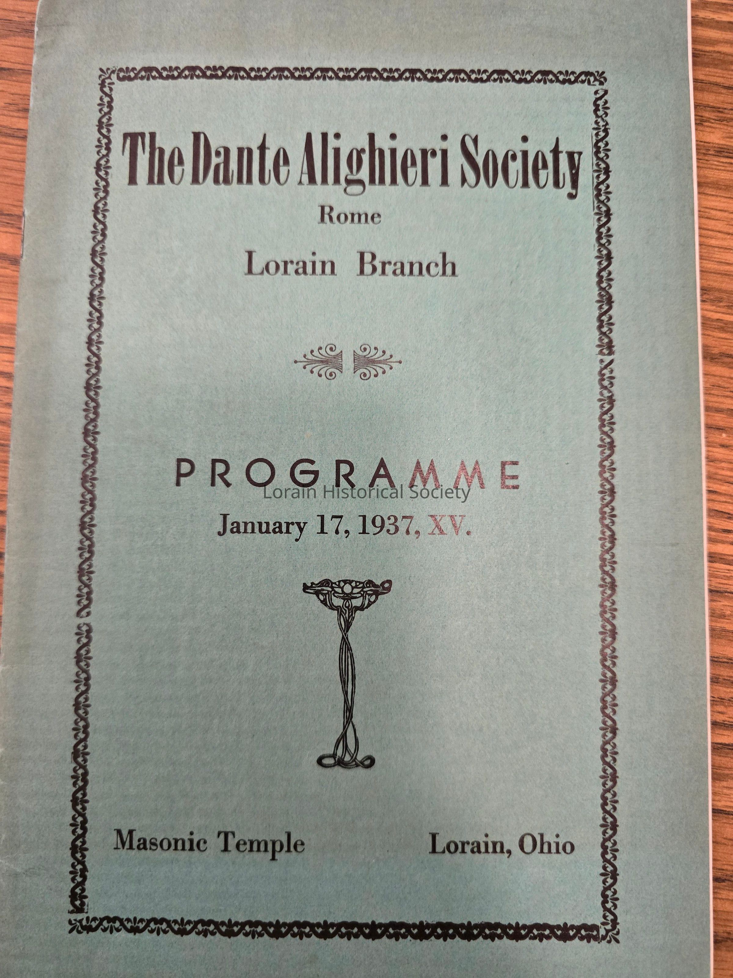 One Program, Jan. 17, 1937 - "Dante Alighieri Society" Rome. Lorain Branch. Held at the Masonic Temple.