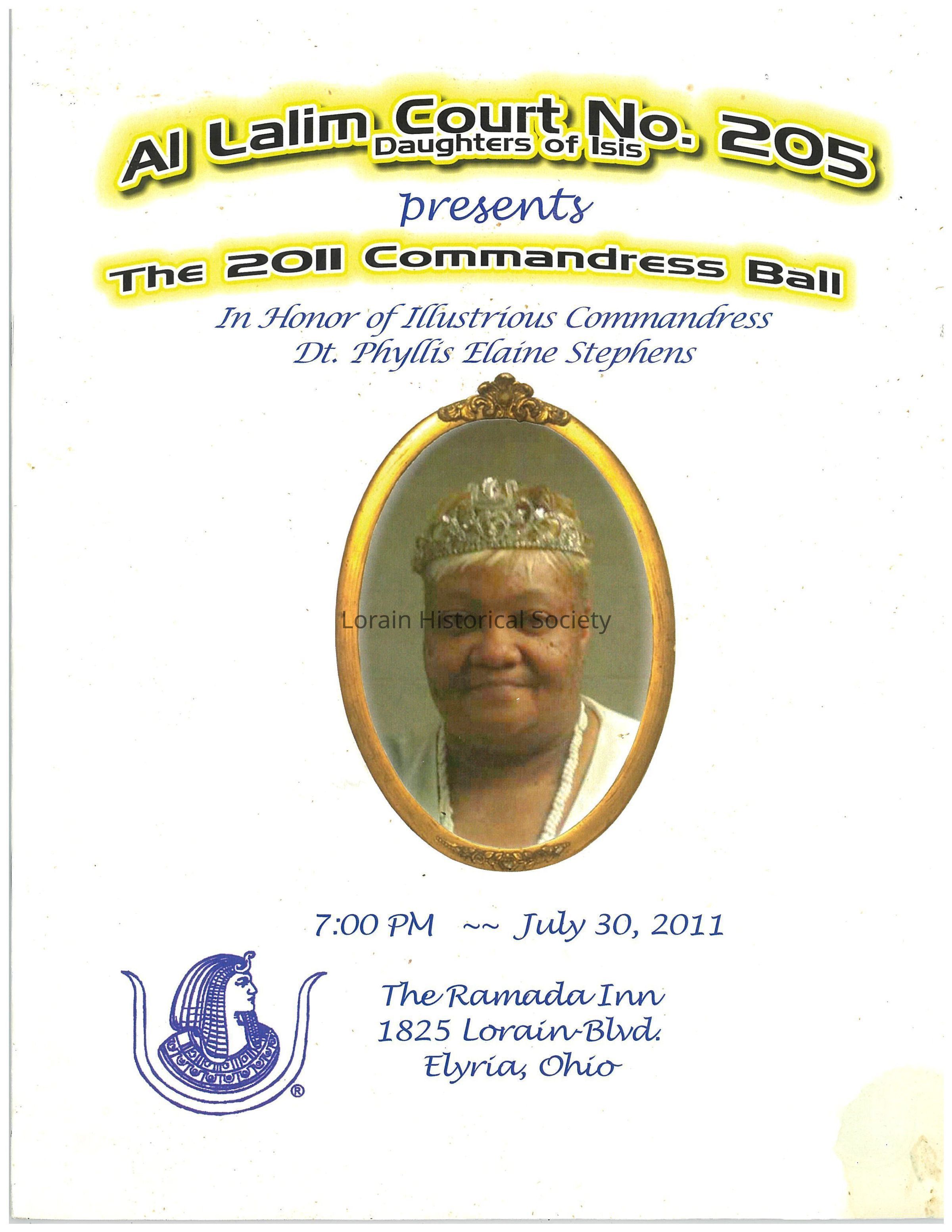 This program booklet is for the 2011 Commandress Ball of the Al Lalim Court No. 205 of the Daughters of Isis. The Daughters of Isis are the female auxiliary to the Ancient Egyptian Arabic Order Nobles Mystic Shrine, the Prince Hall affiliated Shriners. The event honored Dr. Phyllis Elaine Stephens.Collection